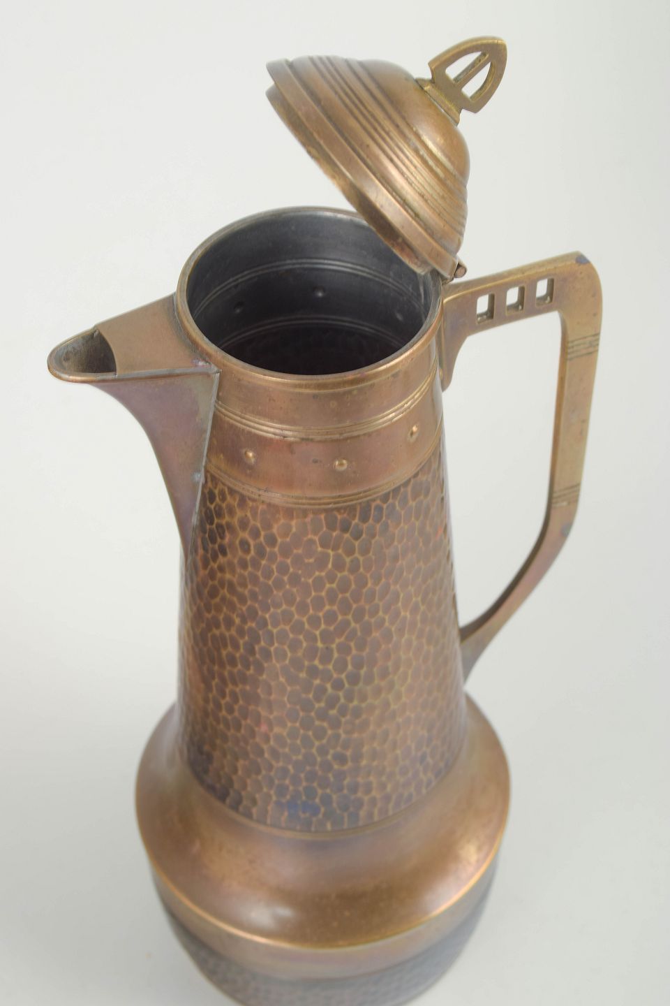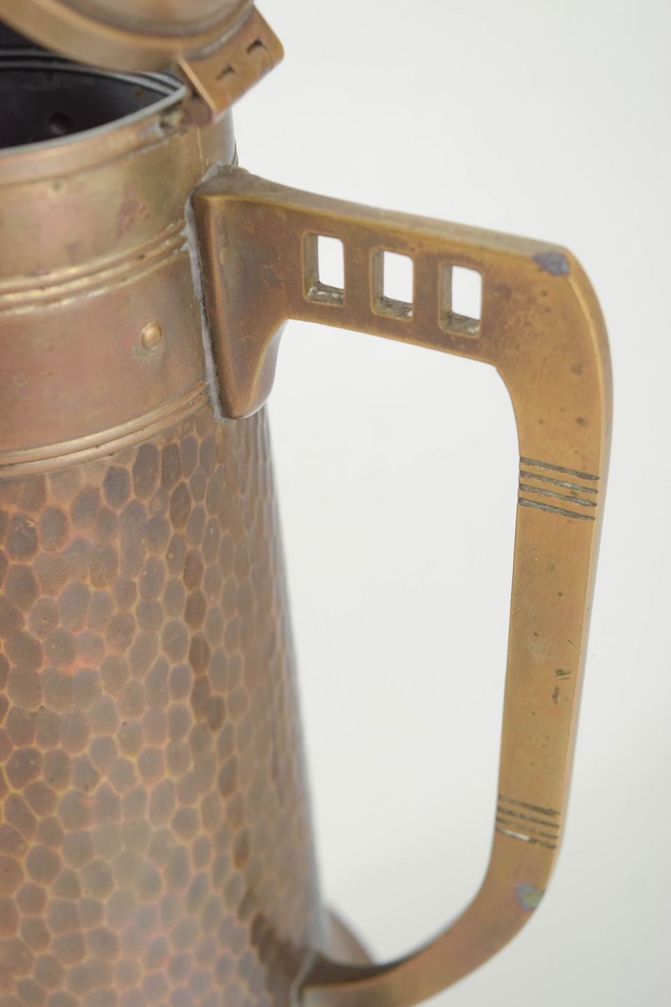 Tysk kobberarbejde omkring år 1900 var stærkt præget af Jugendstil-bevægelsen, hvor funktionelle brugsgenstande blev forenet med kunstnerisk formgivning. Hamrede overflader, geometriske detaljer og elegante proportioner var karakteristiske for perioden. Store kaffekander som denne blev ofte anvendt i hjem og caféer og afspejler tidens fokus på kvalitetshåndværk og holdbare materialer.