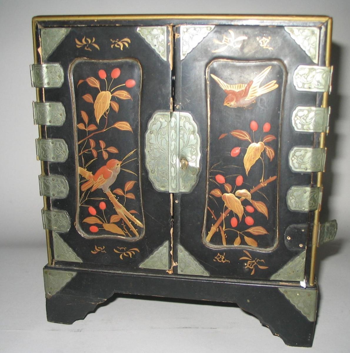 Kinesisk smykkeskrin i lakarbejde med dekorationer i form af fugle på grene med bær. Med to låger; indvendig med tre skuffer - ligeledes med dekorationer. H.: 21 cm. D: 11 cm. B.: 19 cm. Med enkelte afskalninger.