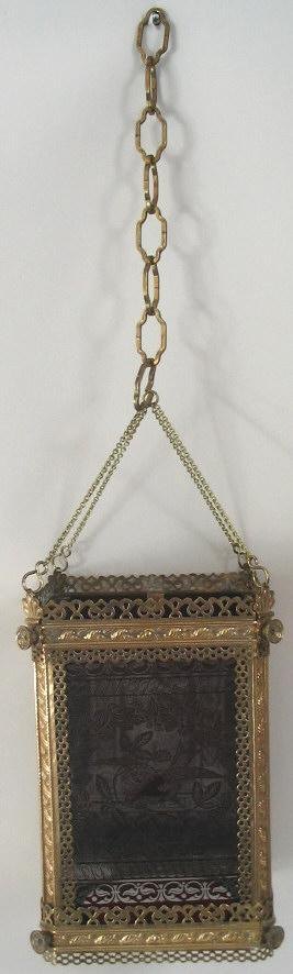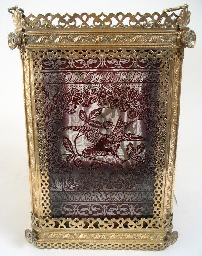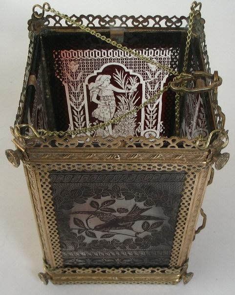 Ampel, Tyskland, ca.1880. I gennembrudt messing med dekorationer i form af roser, afhvalmede hjørner og knopper. Ophængt i kæde. Sider i form af klart glas. Med overfangsdekoration i rødt, med ung kvinde i en have og en fugl på en gren. Bunden i klart glas. H.: 30 cm. B.: 21 cm.