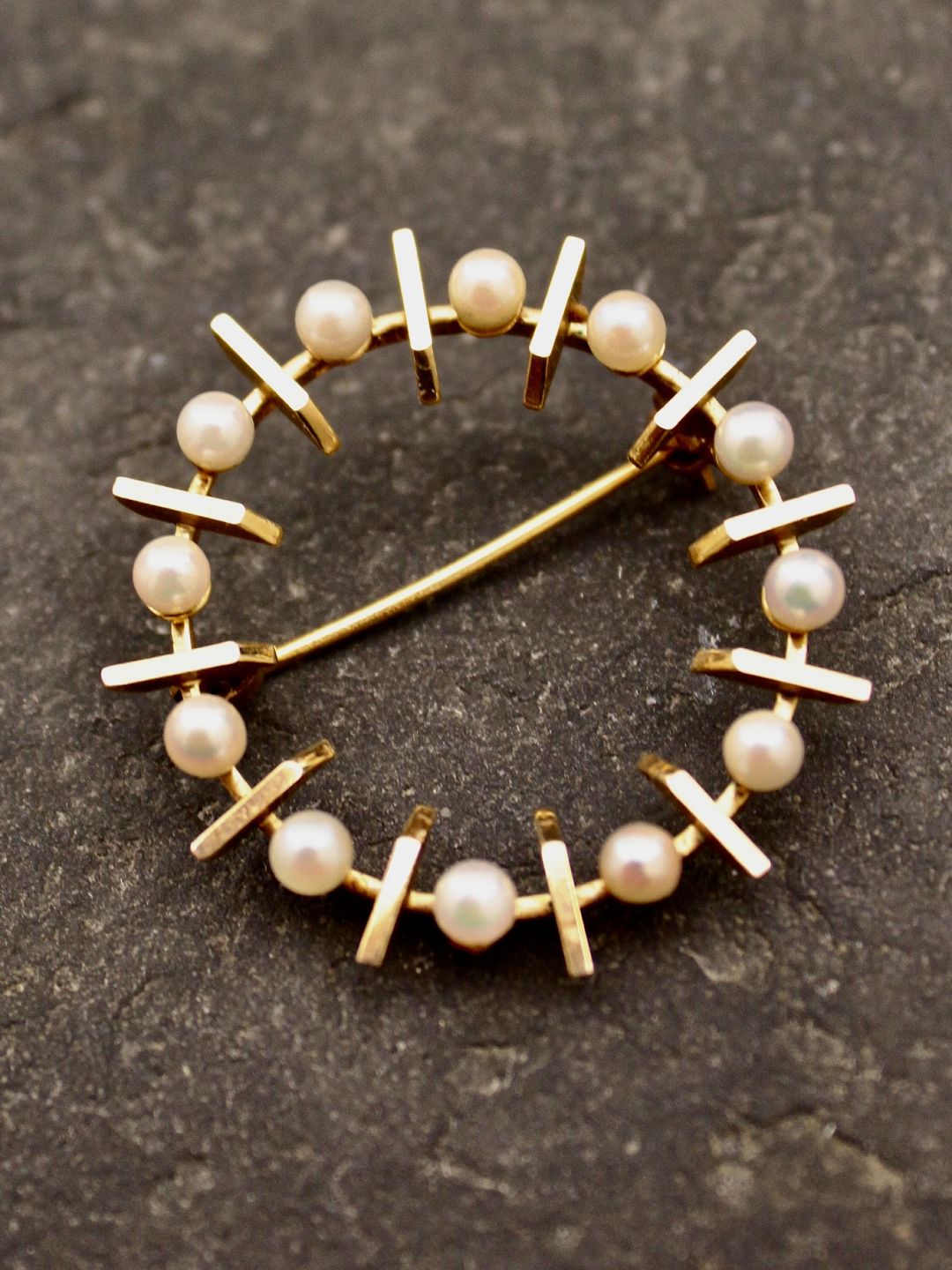 14 karat guld broche med ægte perler