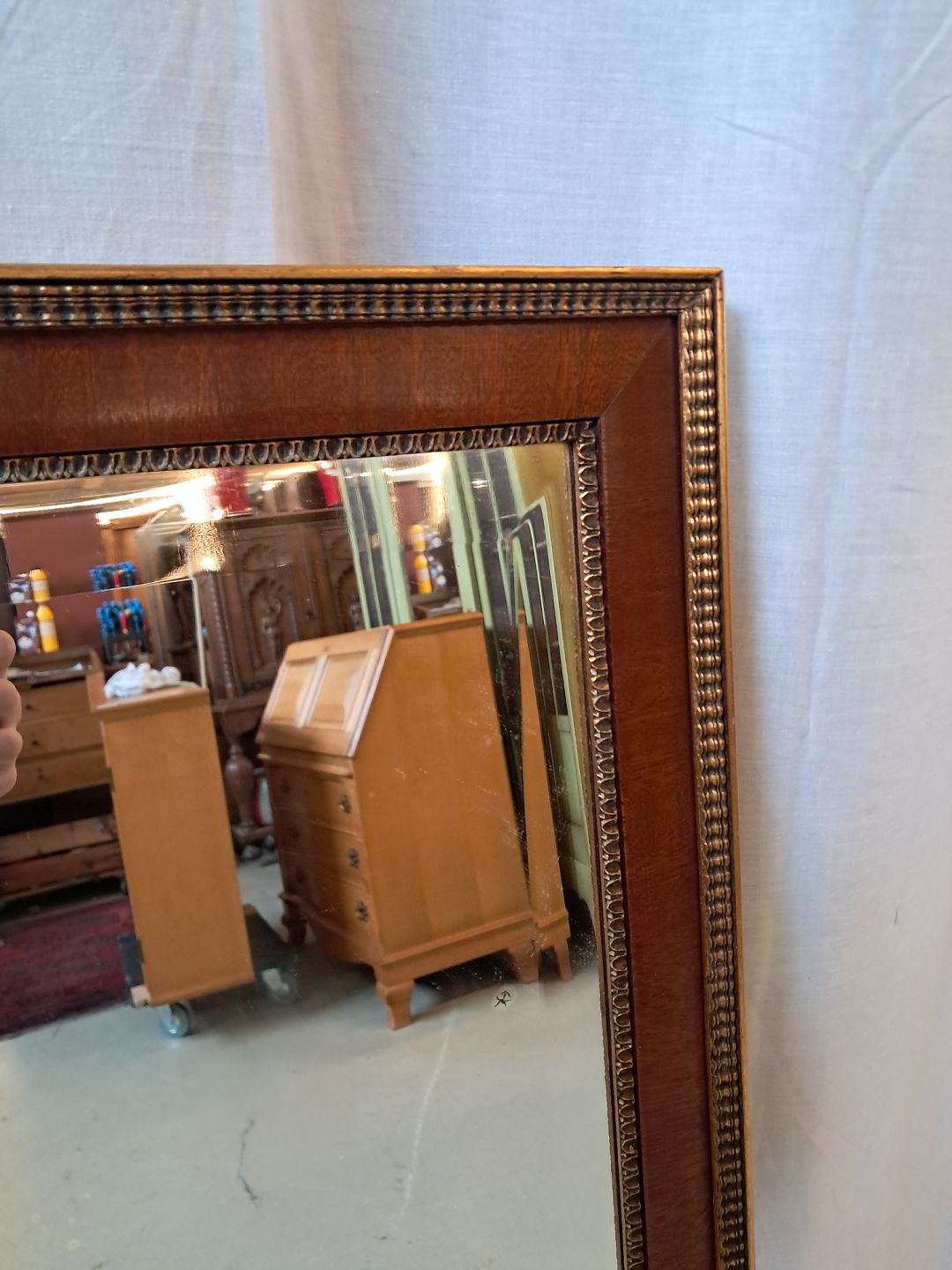 Spejl i fineret mahogni med guldmaling, fra 1950erne.