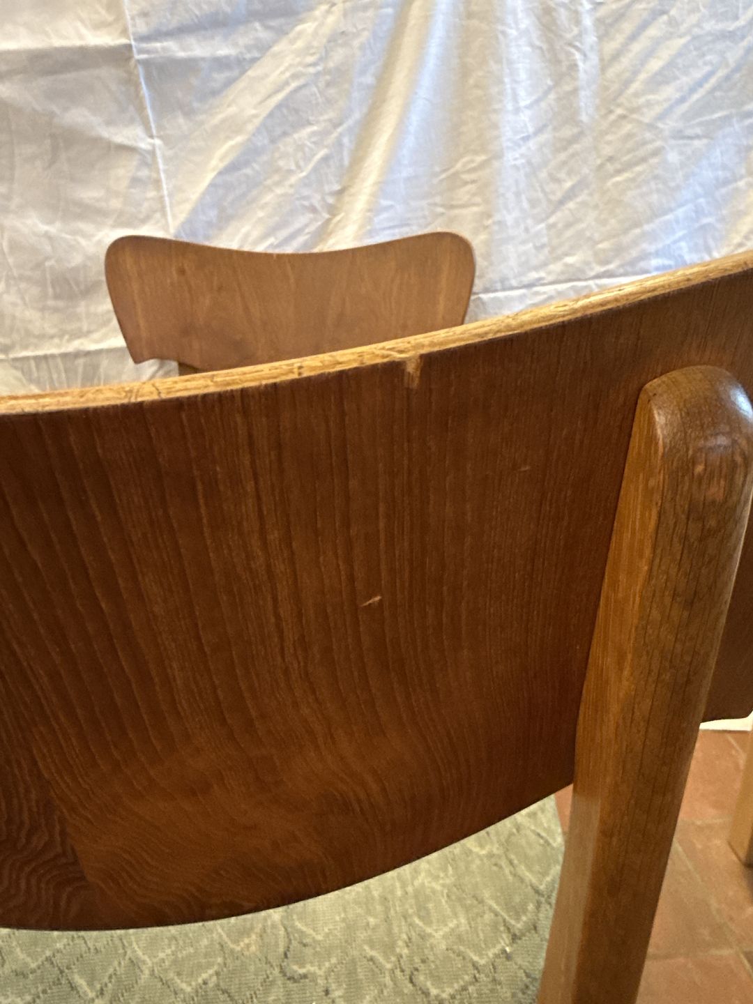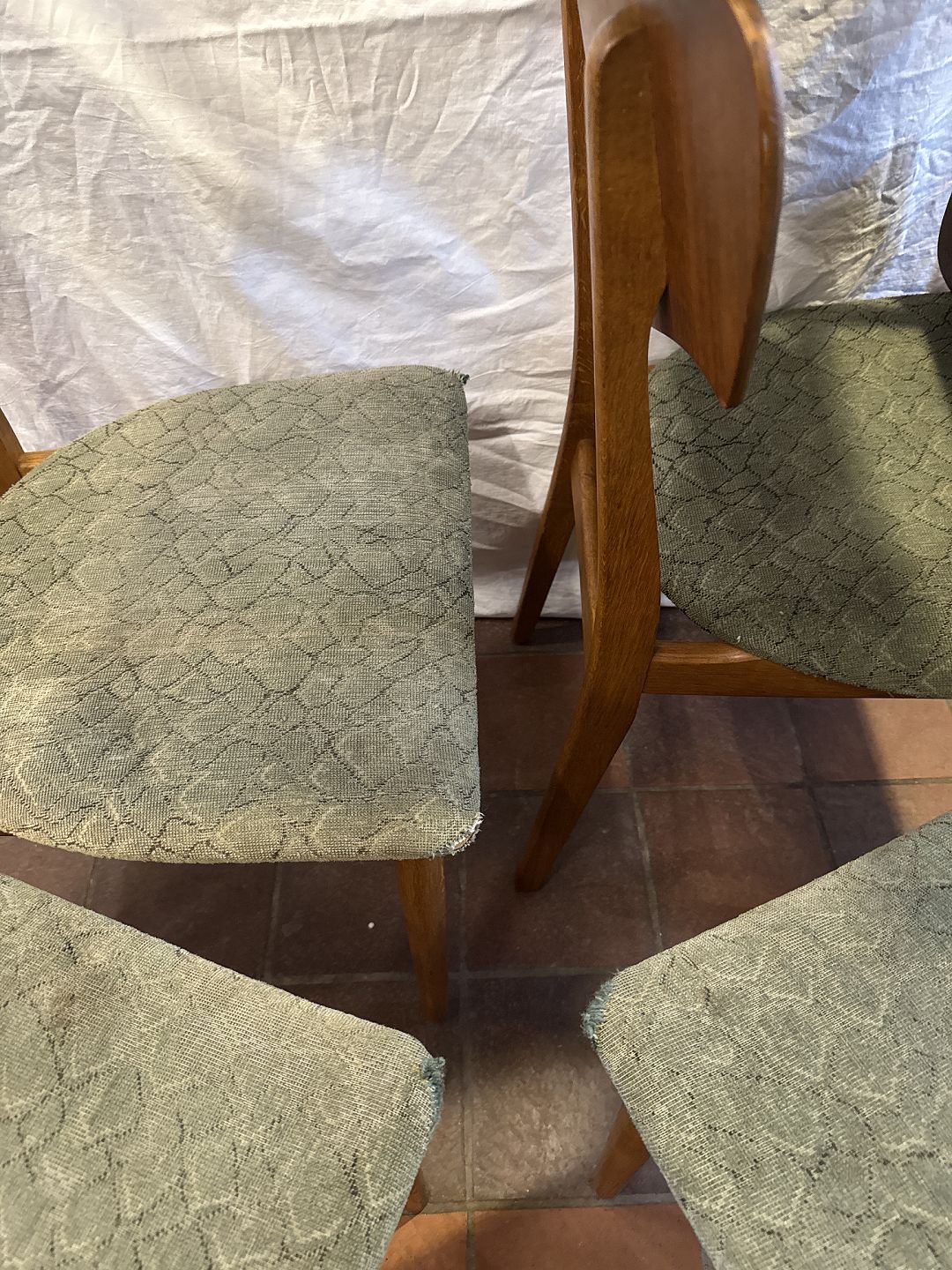 Dansk møbelproducent sæt af 5 spisestuestole i eg m. rygstykke i fineret teak samt sæde betrukket med stof. Fremstillet ca. 1950'erne.