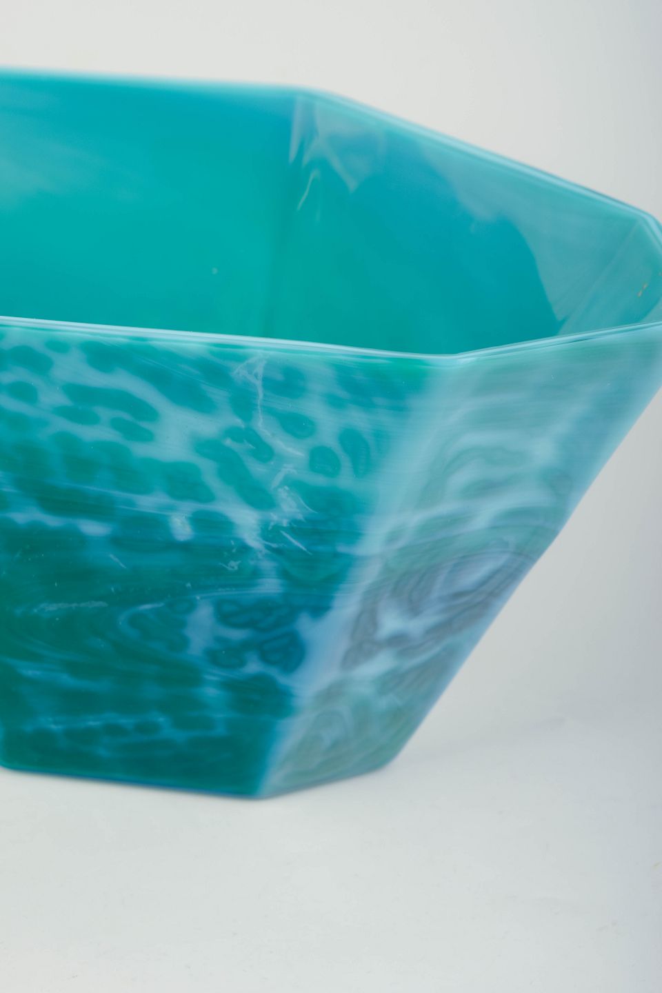 Stor ottekantet skål i kraftigt kunstglas med levende turkisblå nuancer og marmoreret struktur. Fremstillet hos Pukeberg Glasbruk og bevaret med original mærkat.