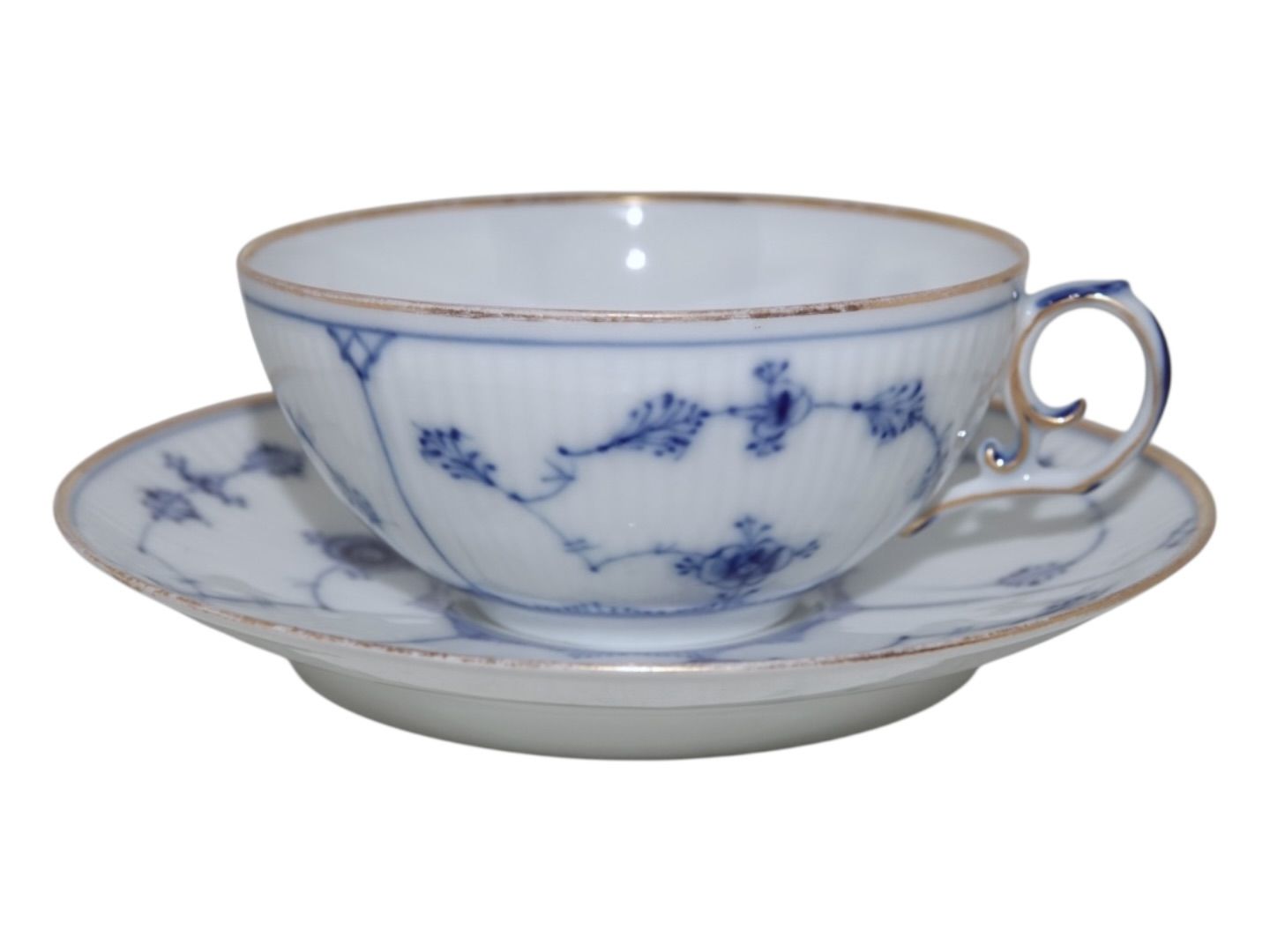 Royal Copenhagen Musselmalet Riflet med guldkant, tekop der er tynd i porcelænet.