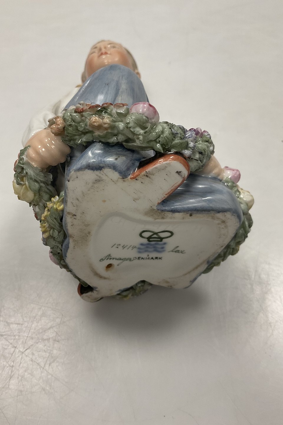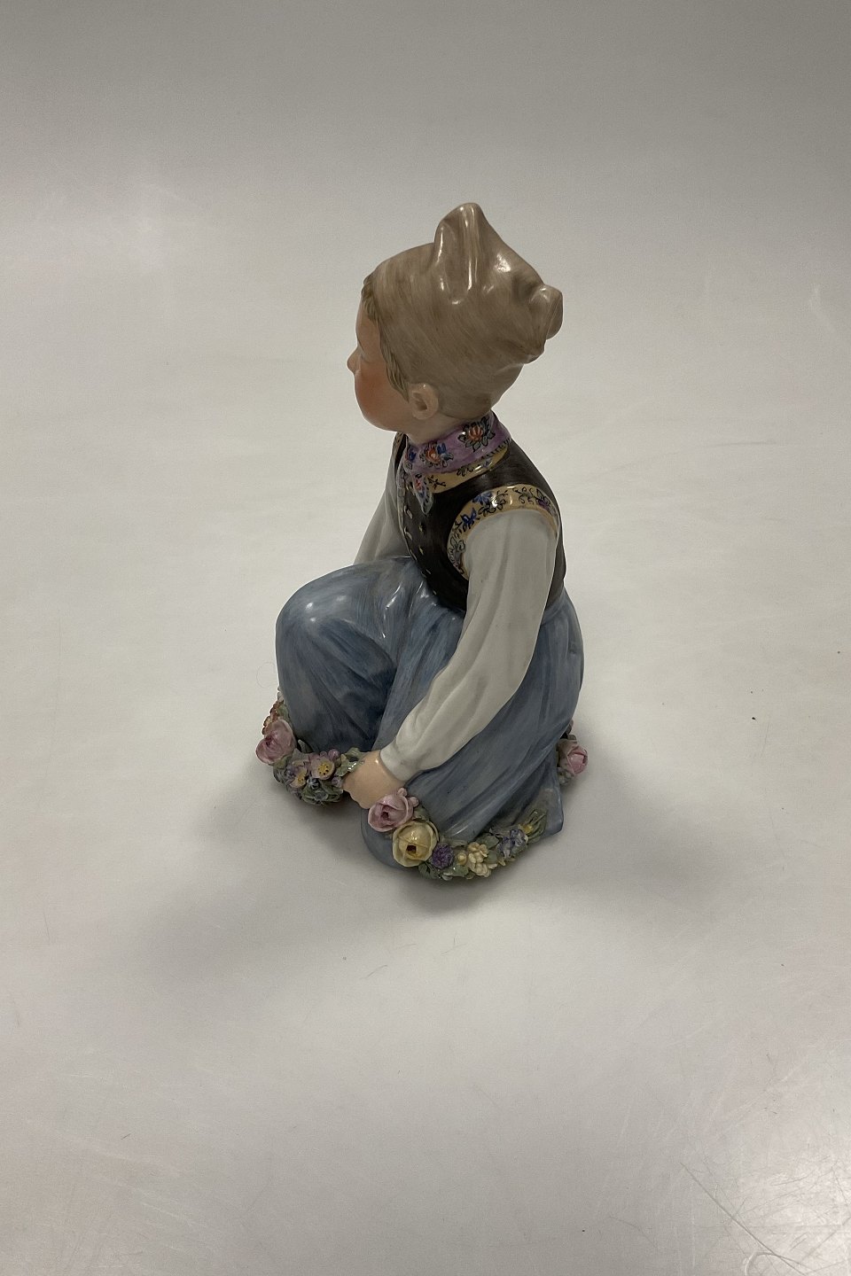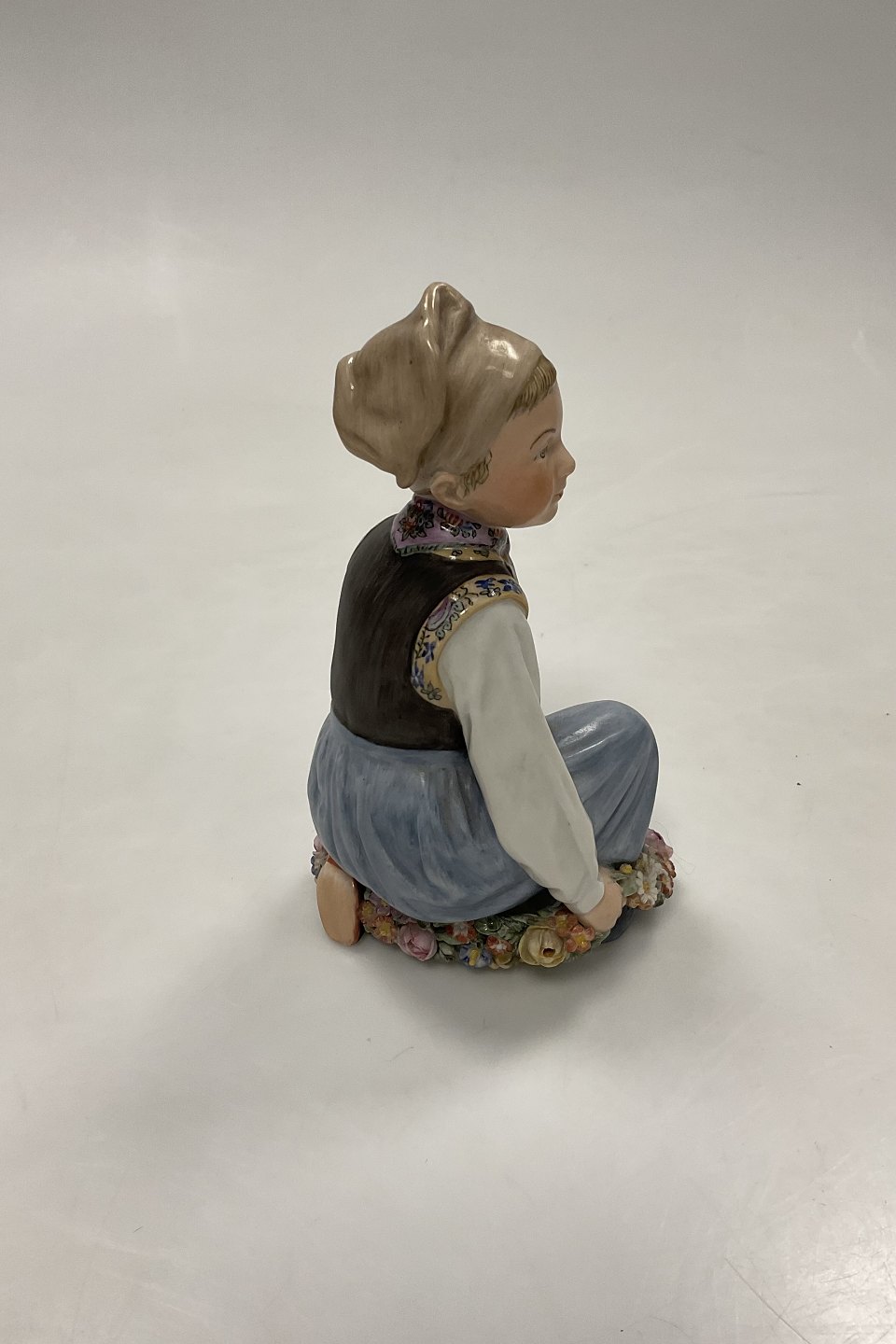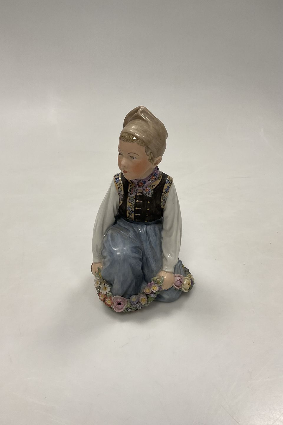 Royal Copenhagen Overglasur Figur Amager Dreng No. 12414. Måler 15cm (5 29/32 in.) Har nogle små afslag på blomster.Se venligst foto.