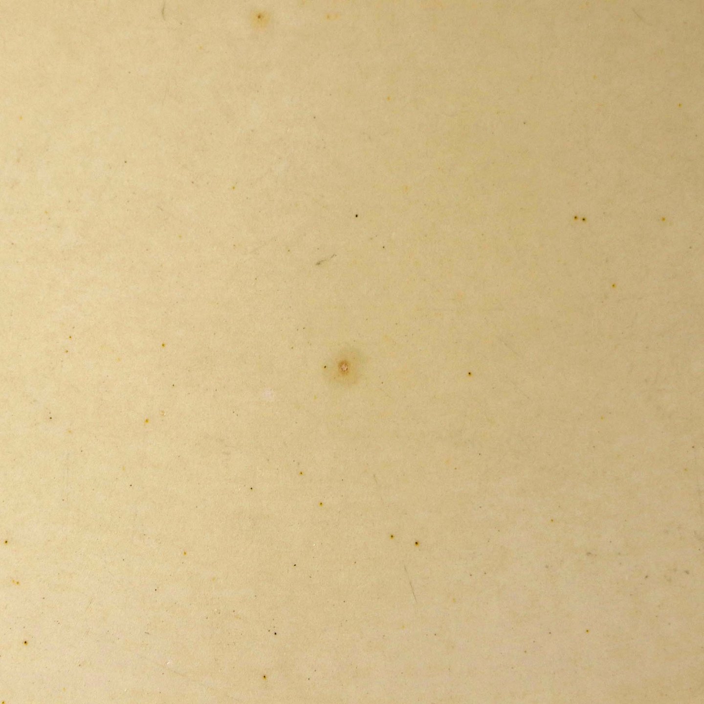 Fremstår med ujævnhed i glasuren enkelte ridser samt brugsspor på baggrunden.