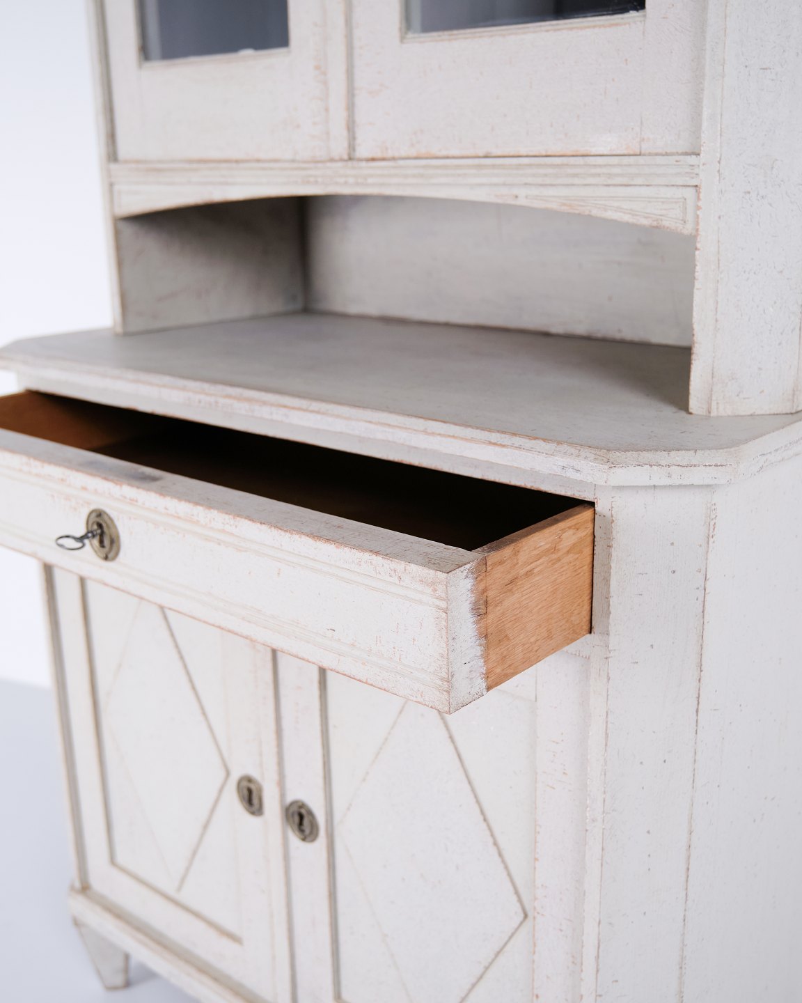 Stort svensk vitrineskab fra gustaviansk periode ca. 1790’erne. Glaslåger, hylder og skuffe.