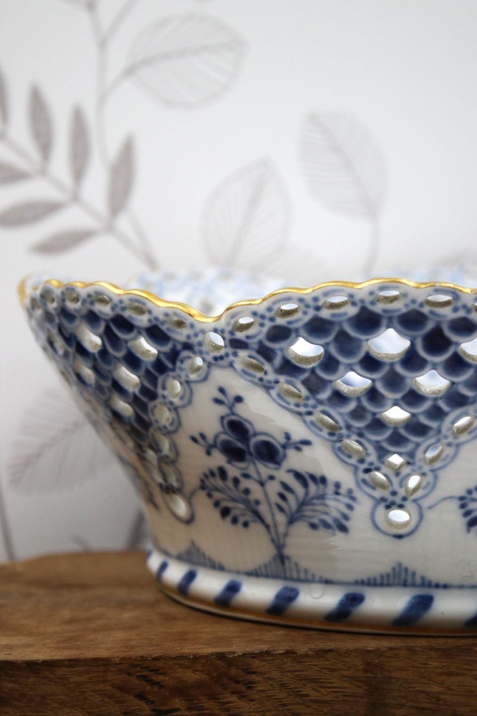 Antik Musselmalet frugtskål med gennembrudt kant og guldkant.