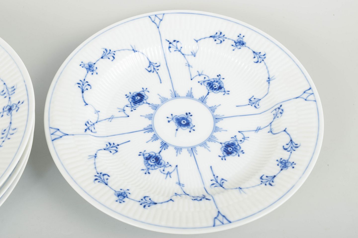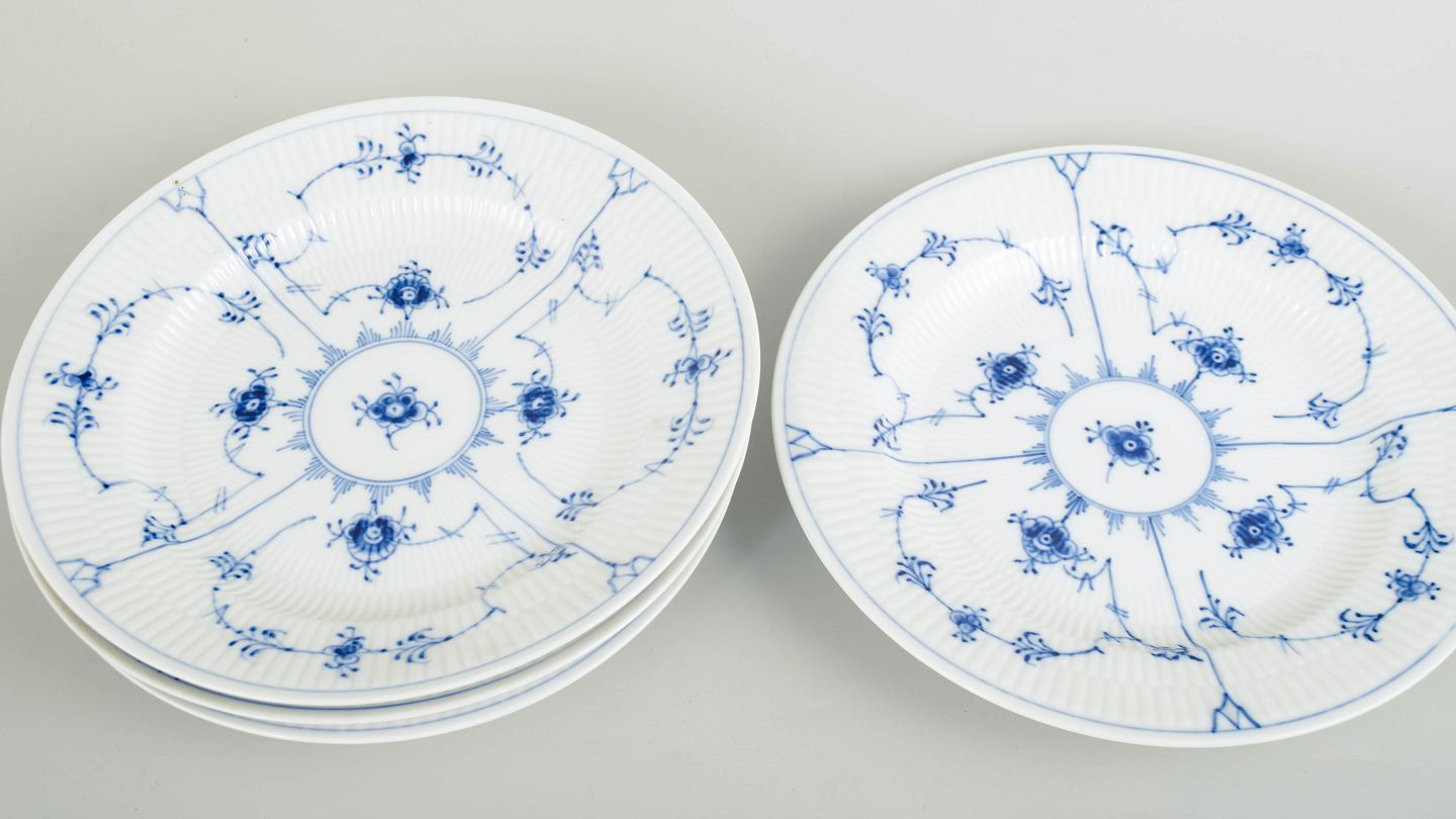 Royal Copenhagen Musselmalet Riflet, sæt af fire middagstallerkener.