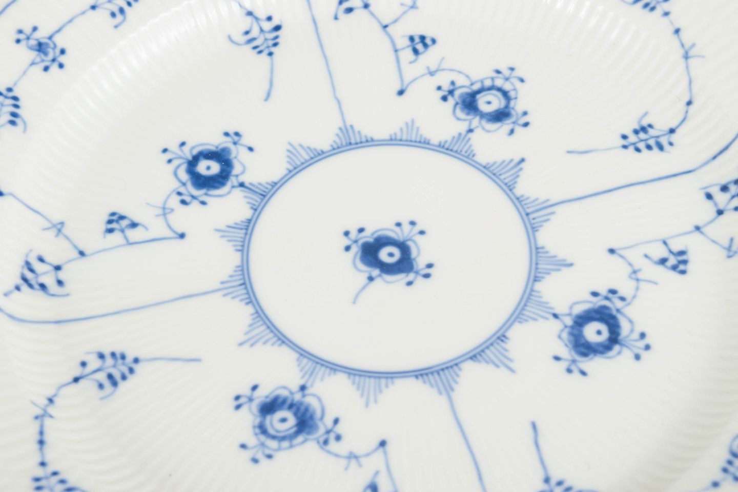 Stort rundt fad i håndmalet porcelæn fra Musselmalet Riflet med klassisk underglasurdekoration i koboltblå. Model 1/107. Første sortering. Fremstillet i 1970’erne.