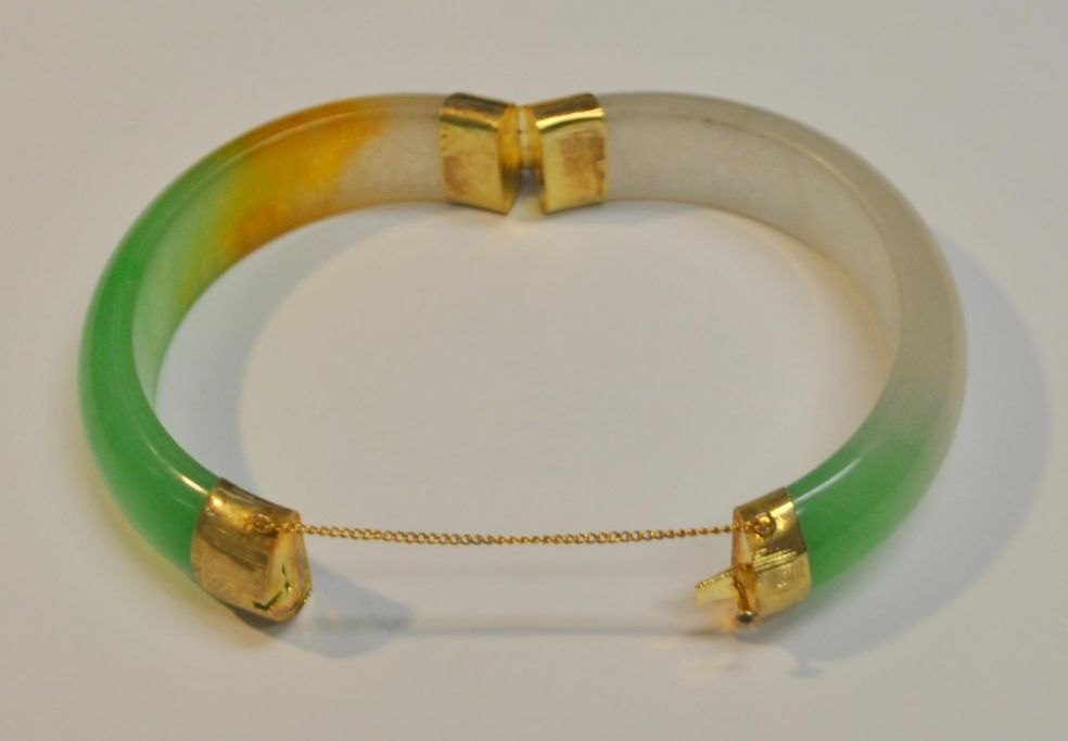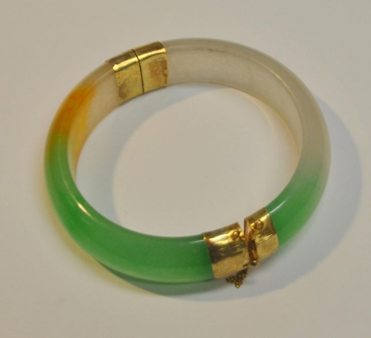 Kinesisk jade armbånd, 20. årh. Med guld lås i 8 K rødguld. Indvendig diameter: 6,2 cm. Udvendig: 8 cm.