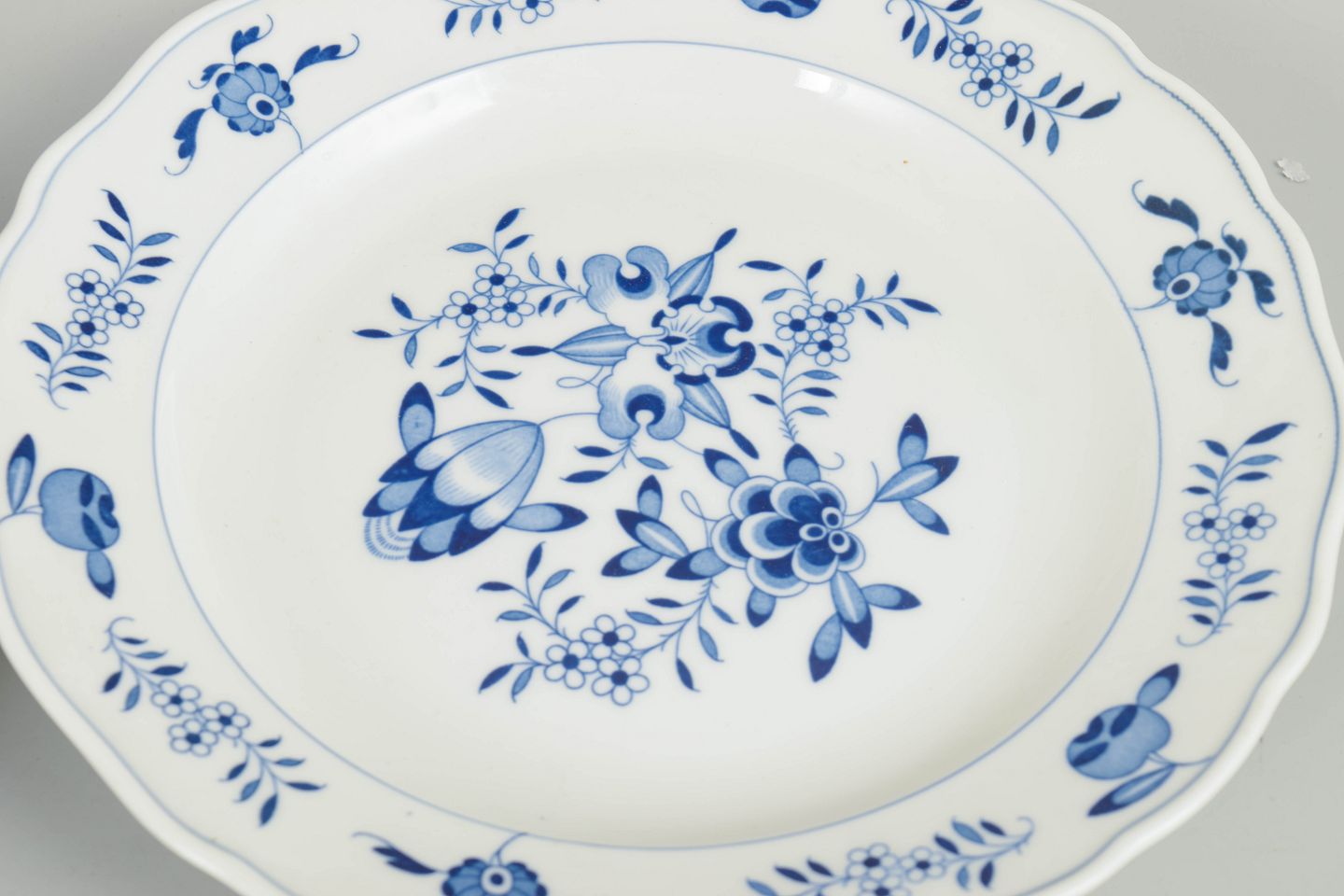 To middagstallerkener i håndmalet porcelæn med Blå Orkidé dekoration. Fremstillet hos Meissen og mærket med Meissen krydssværd. Annulleret med to indridsede streger under bunden.