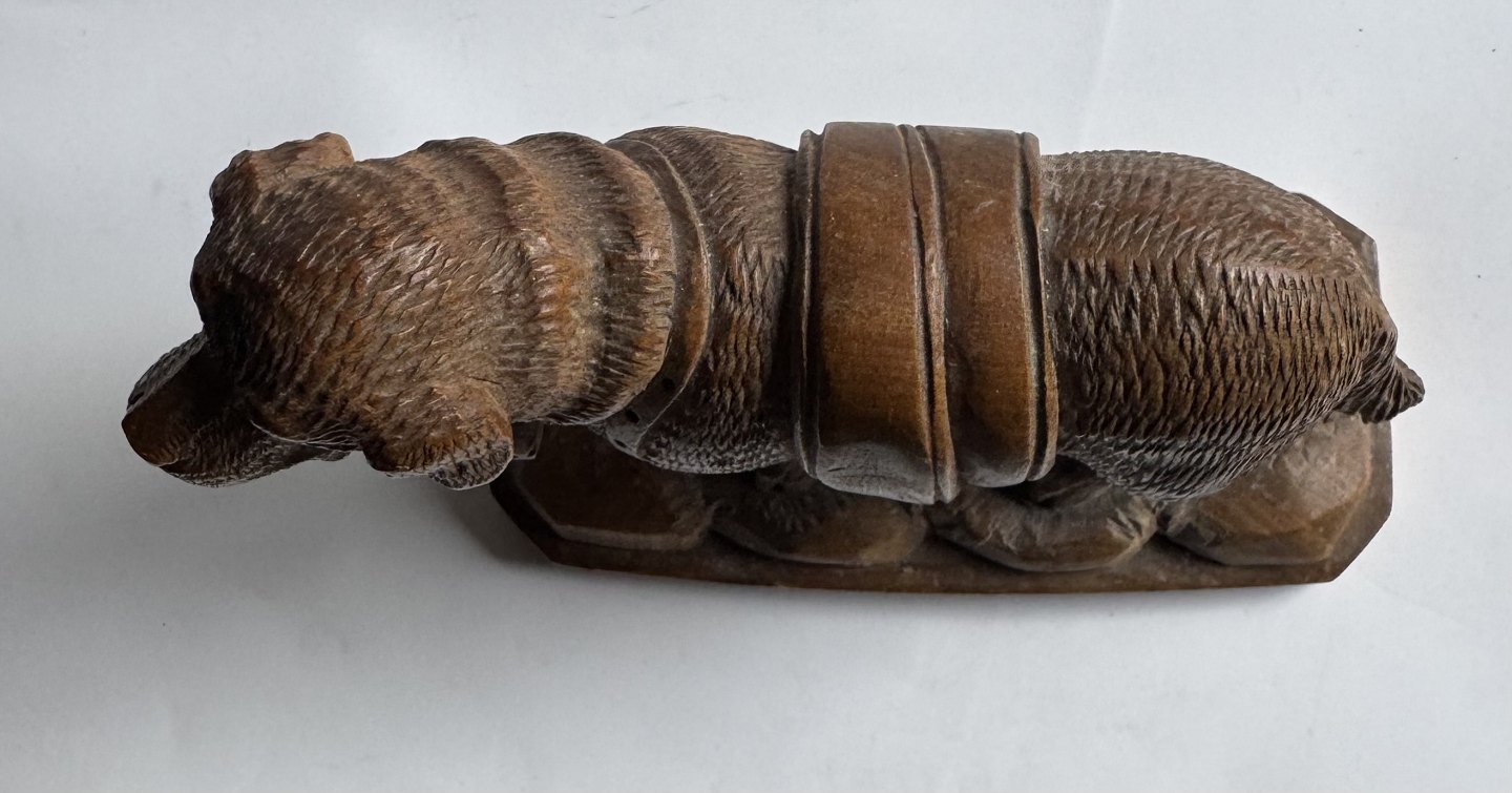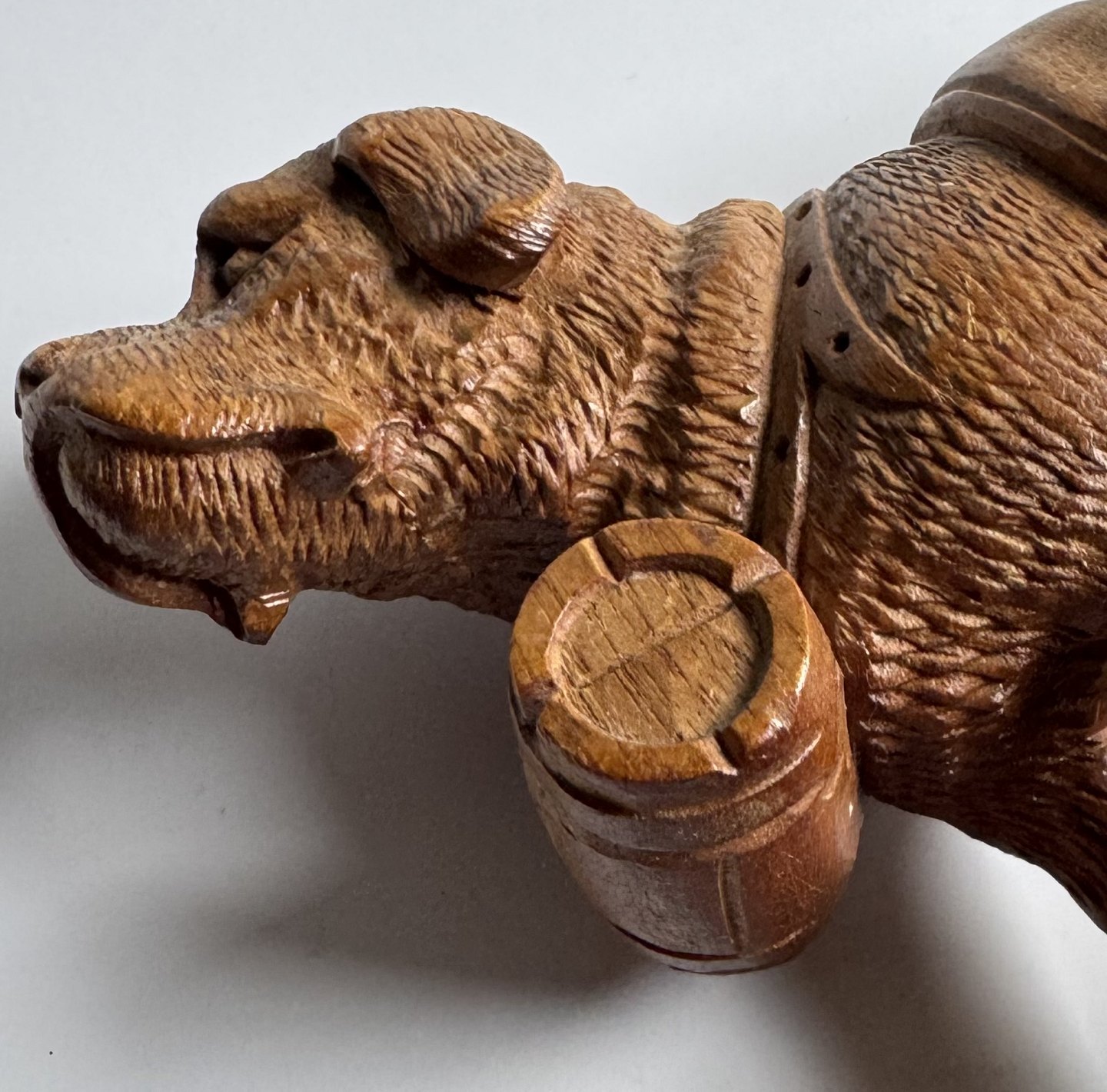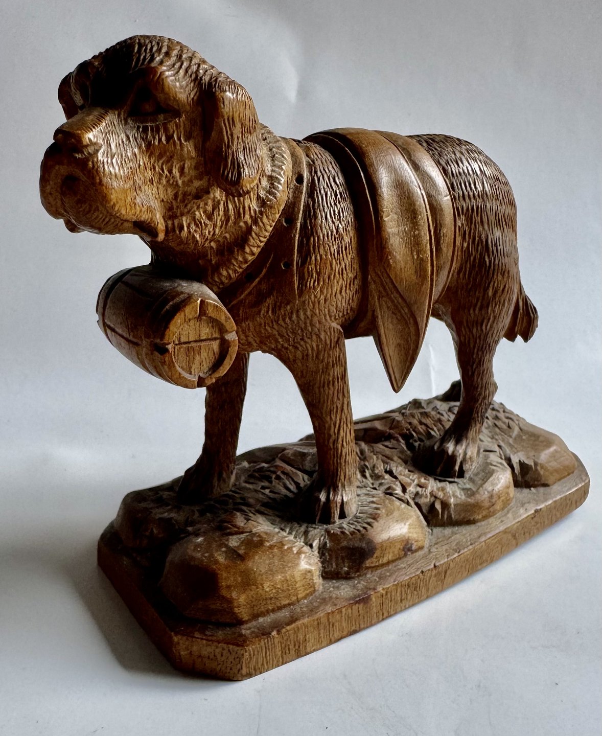 Udskåret figur i lindetræ forestillende en Sankt Bernard hund med den evige tønde i træ rundt om halsen. Fremstillet i Schweiz i begyndelsen af 20. århundrede. Fremstår i god stand uden skader eller reparationer. Mål: H. 12,5 cm. Basen måler 6,2 x 13,4 cm.