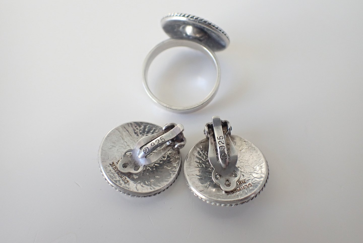 Text available in Danish: Borells - sterling sølvsæt bestående af ring og øreclips.