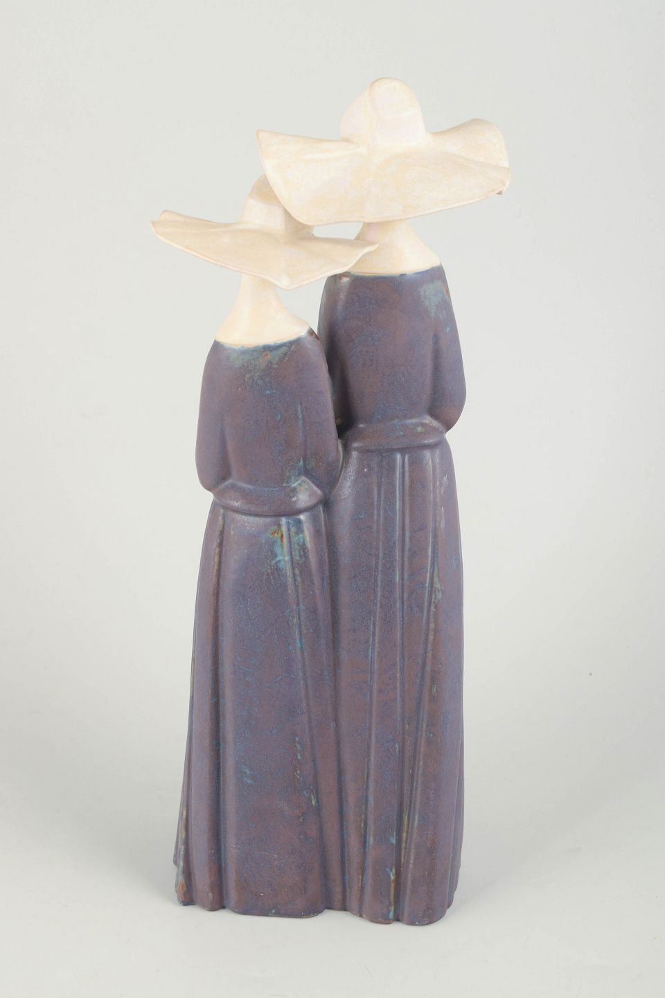 Monumental keramisk figurgruppe fra 1980’erne, fremstillet i porcelæn med karakteristisk blød modellering og afdæmpet glasur i violette og cremefarvede toner. Figuren forestiller to stiliserede kvindeskikkelser med brede hatte og elegante, vertikale kjolelinjer. Undersiden mærket Lladró, Hand Made in Spain, Daisa.