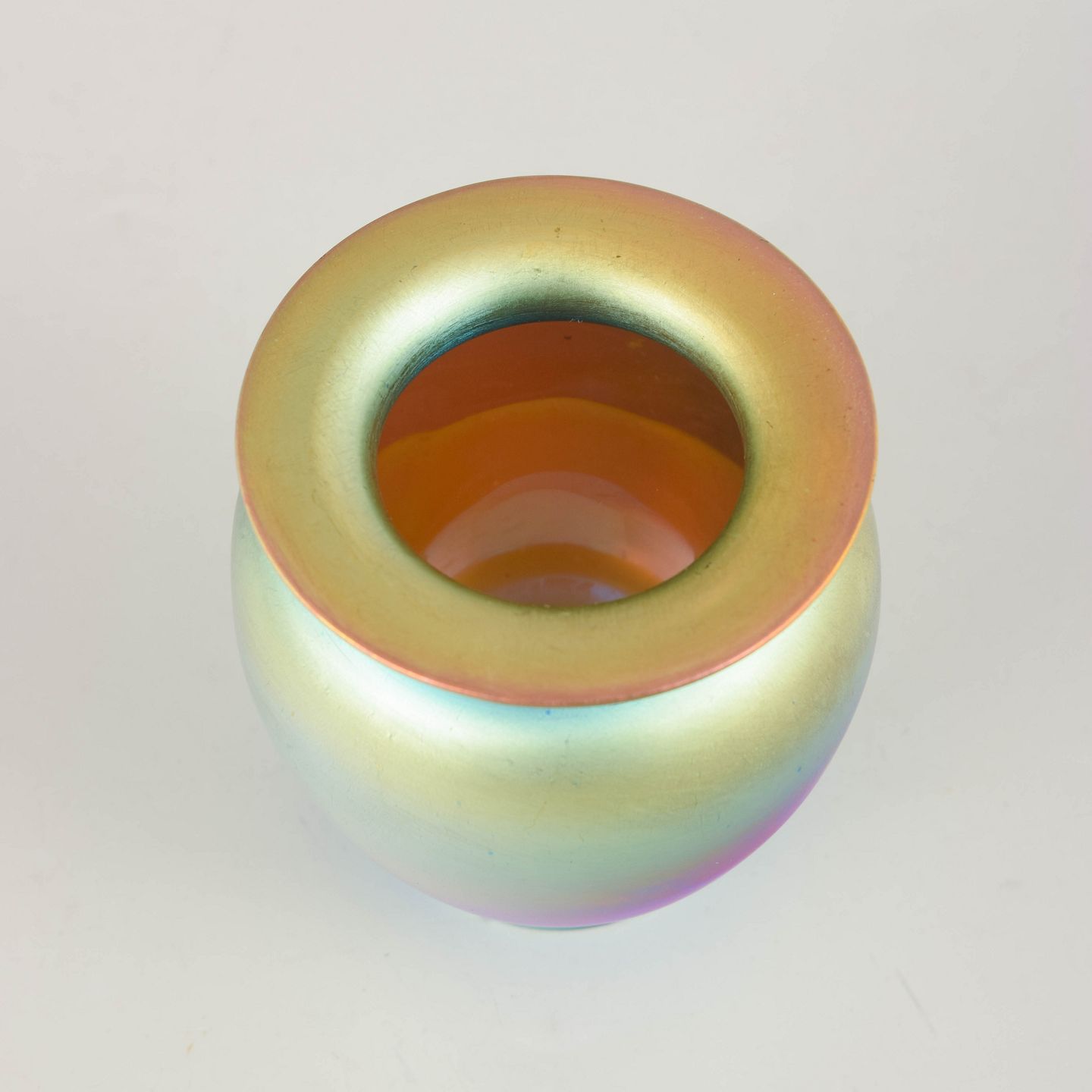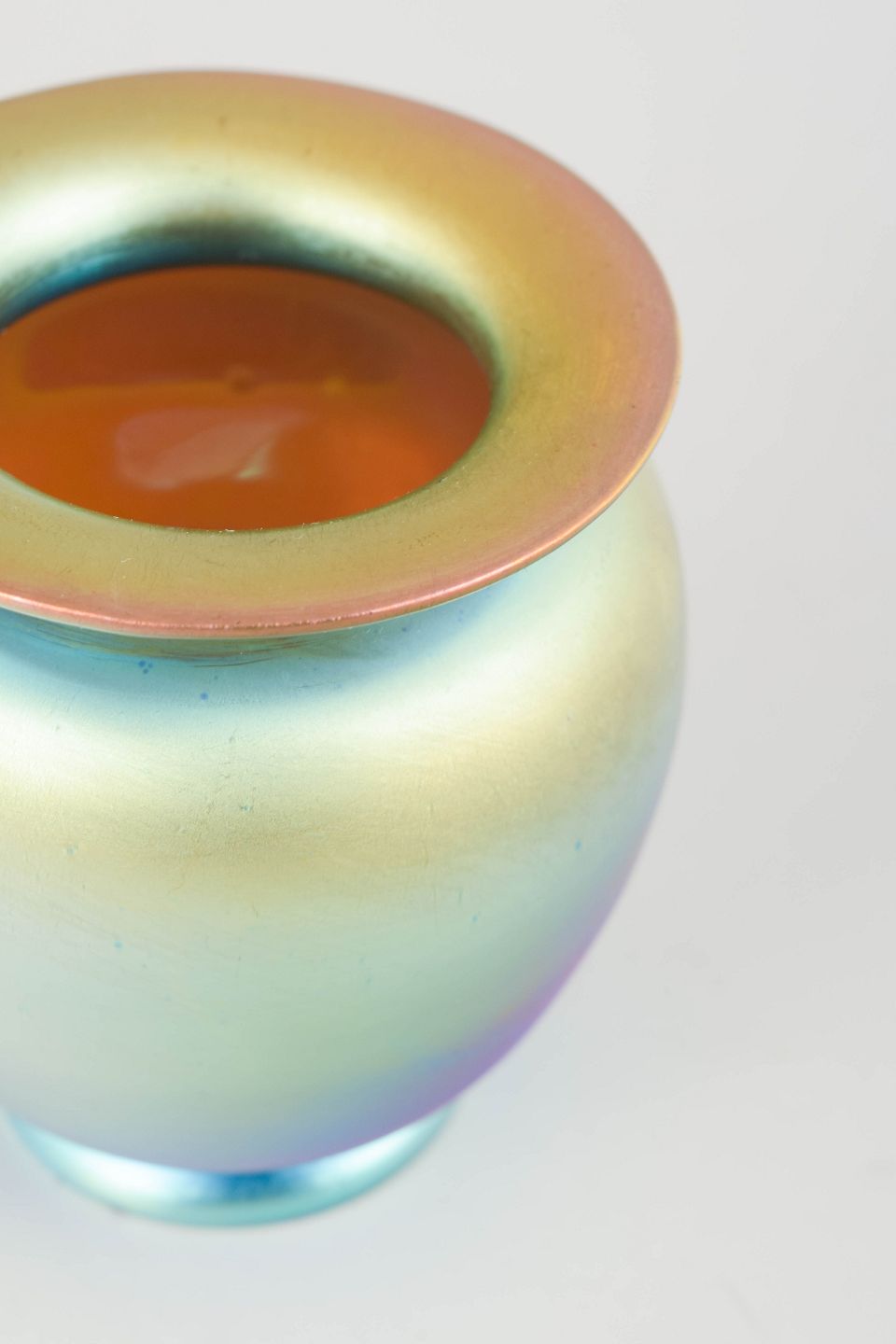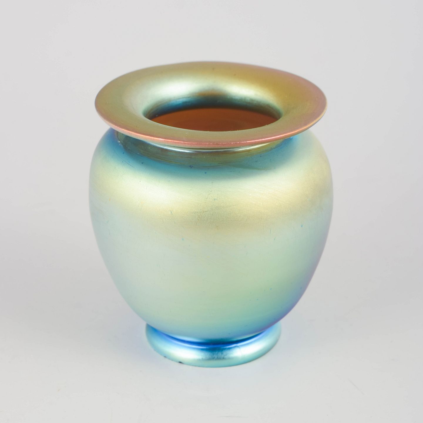 Elegant vase i mundblæst glas med silkemat iriserende overflade i blågrønne og gyldne nuancer med kobberfarvet skær ved mundingen. Den harmoniske, afrundede korpus med bred, udadbøjet krave og lille standring er karakteristisk for Loetz’ produktion i 1920’erne, hvor subtile farveovergange og metallisk glans blev kombineret med enkle, velafbalancerede former.