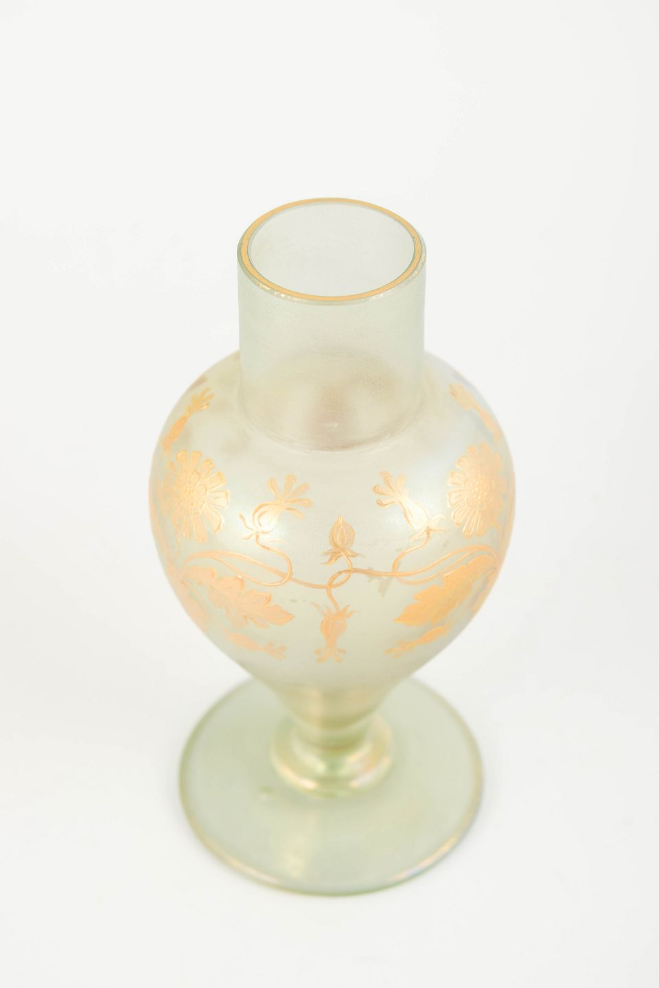 Dekorativ vase i mundblæst glas med mat, let opaliserende overflade i grønlig tone og iriserende, floralt slyngende dekoration i gyldne og rosa nuancer. Den balusterformede krop med cylindrisk hals og rund fod er karakteristisk for Loetz’ produktion i mellemkrigstiden, hvor klassiske former blev kombineret med raffinerede overfladeeffekter.