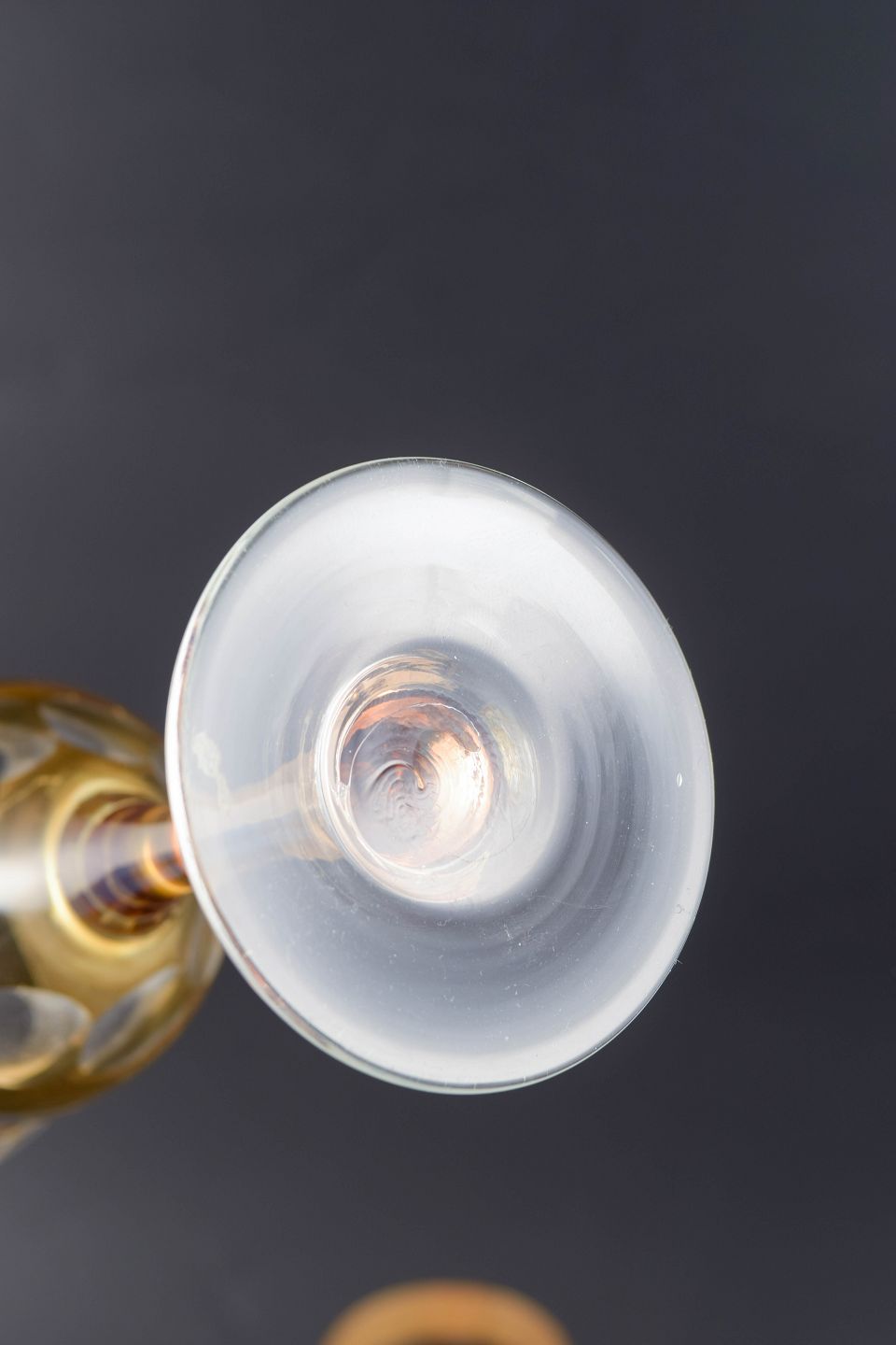 Elegante rødvinsglas i facetslebet og forgyldt krystal med ravfarvet cuppa og slank stilk. Dekoreret med geometrisk mønster og delvis mat forgyldning langs randen, typisk for bøhmisk glasproduktion fra mellemkrigstiden.