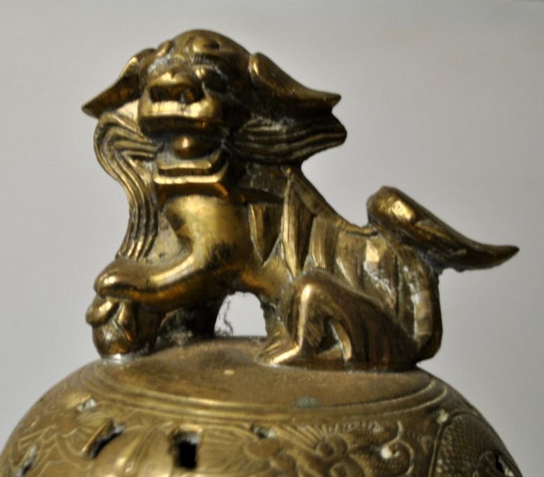 Kinesisk røgelseskrukke i bronze på tre ben, 19. årh. Med to ører; gennembrudt låg med dekoration i form af løve. På korpus dekoreret med drage og blomster. H.: 32 cm. B.: 25 cm. Stemplet.