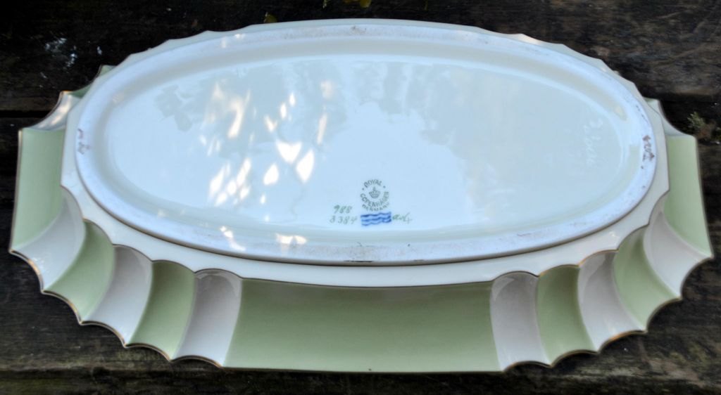 Royal Copenhagen jardiniere 988/3384, 20. årh. København, Danmark. Cremefarvet med grøn fond og forgyldninger. Stemplet. H: 9,3 cm. L: 37,5 cm. B: 19,5 cm.
