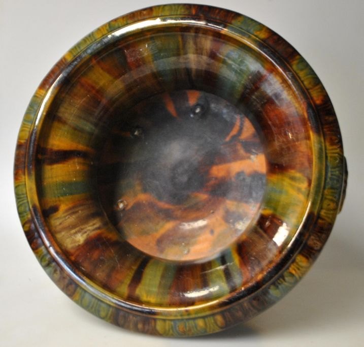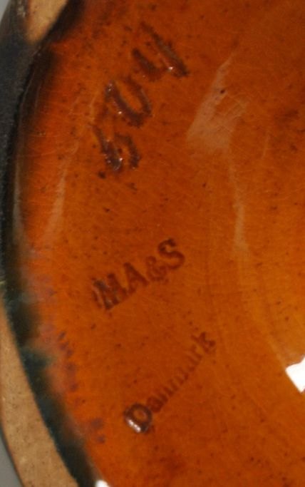 Michael Andersen & Søn keramik opsats nr. 504, 20. årh. Bornholm, Danmark. Gul, brun, orange og grøn glasur. Stemplet: MA&S Danmark. H: 20 cm. Dia: 27 cm.