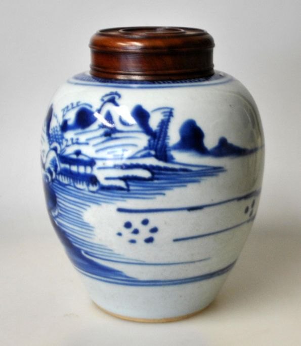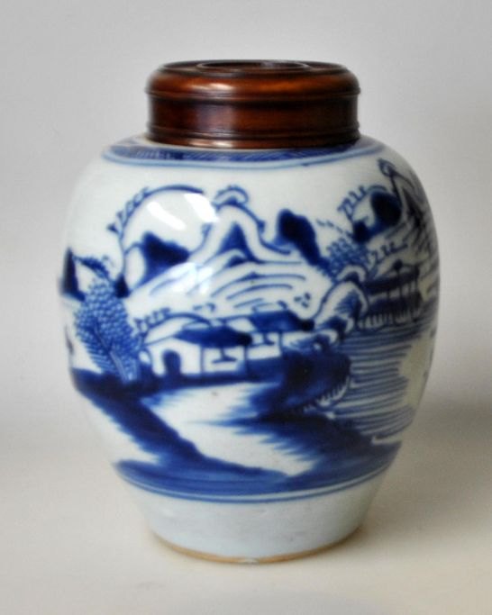 Kinesisk porcelæns bojan, 19. årh. Med blålige håndmalede landskabsdekorationer. Med trælåg. Højde med låg: 15 cm.