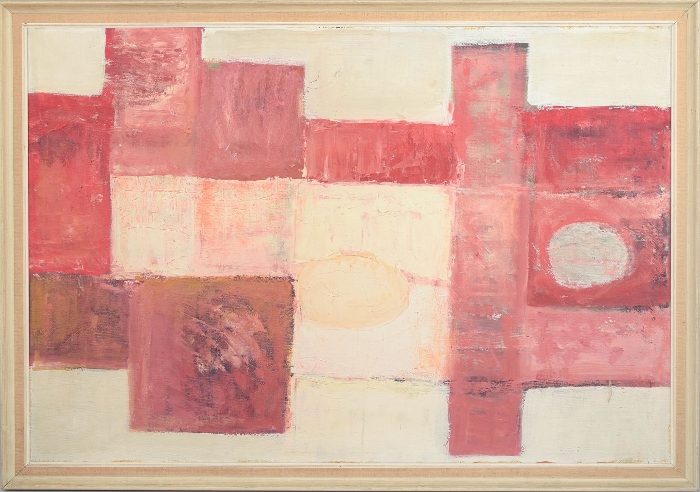 Abstrakt komposition udført i olie på lærred med geometriske og arkitektoniske former i varme røde og rosa toner, signeret JVR og dateret 1966.