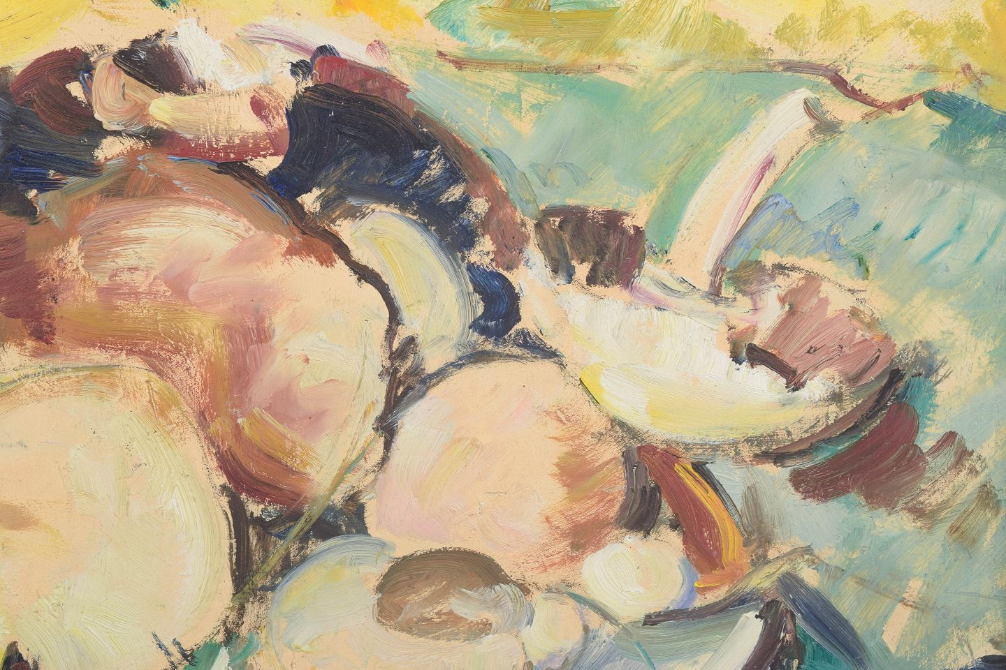 Ekspressivt stilleben med svampe arrangeret på fad, udført med brede og frie penselstrøg i varme gule, grønne og jordfarvede nuancer.