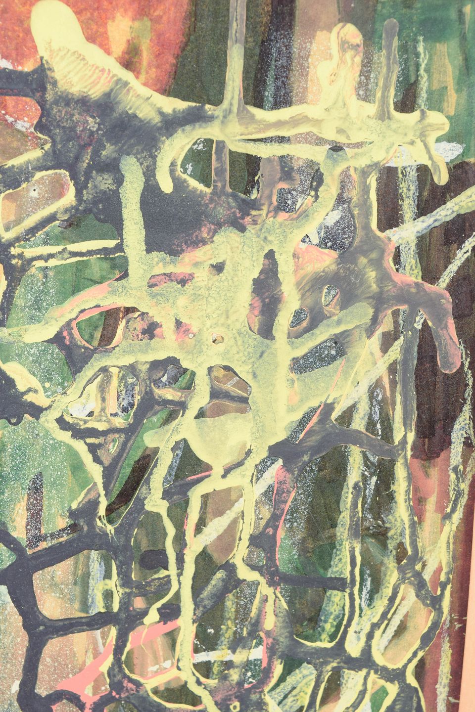 Abstrakt komposition udført i mixed media på papir med kraftige lag af farve, dryppede linjer og ekspressive penselstrøg i grønne, gule, sorte og rosa toner. Kompositionen har et spontant og gestisk udtryk med overlappende former og strukturer.