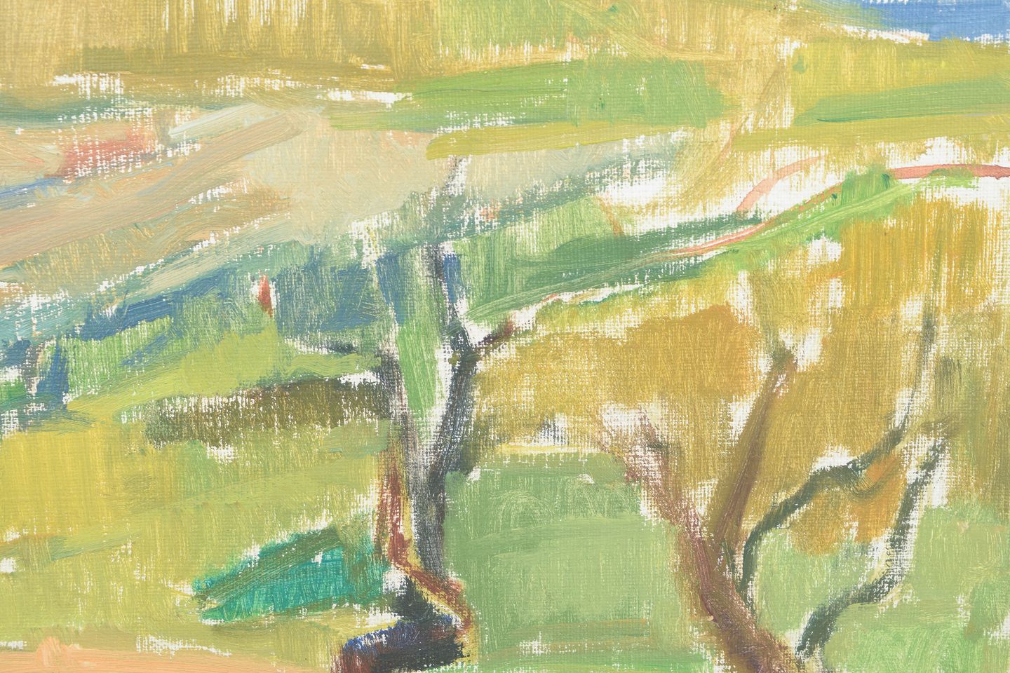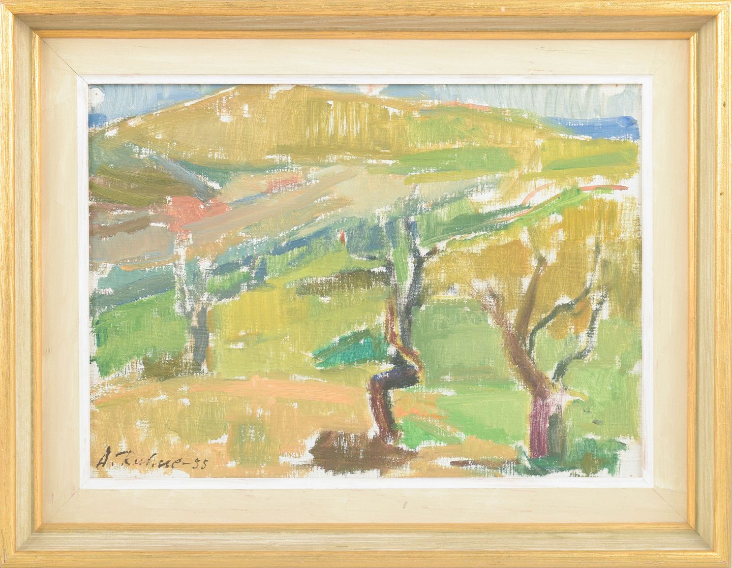 Modernistisk landskabsmotiv udført i brede, ekspressive penselstrøg med let abstraherede træformer og farveflader i grønne, gule og jordfarvede toner. Signeret og dateret 1955.