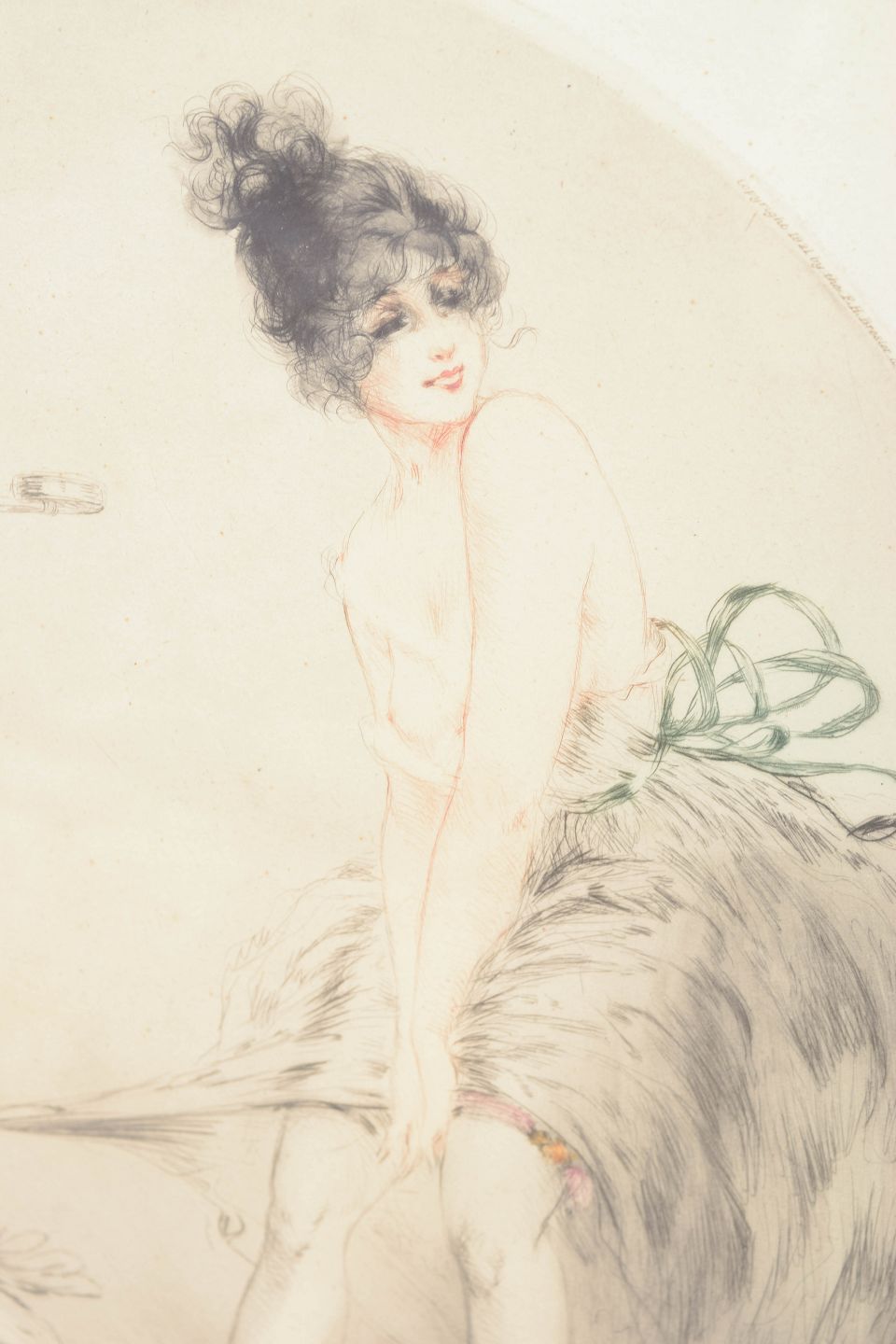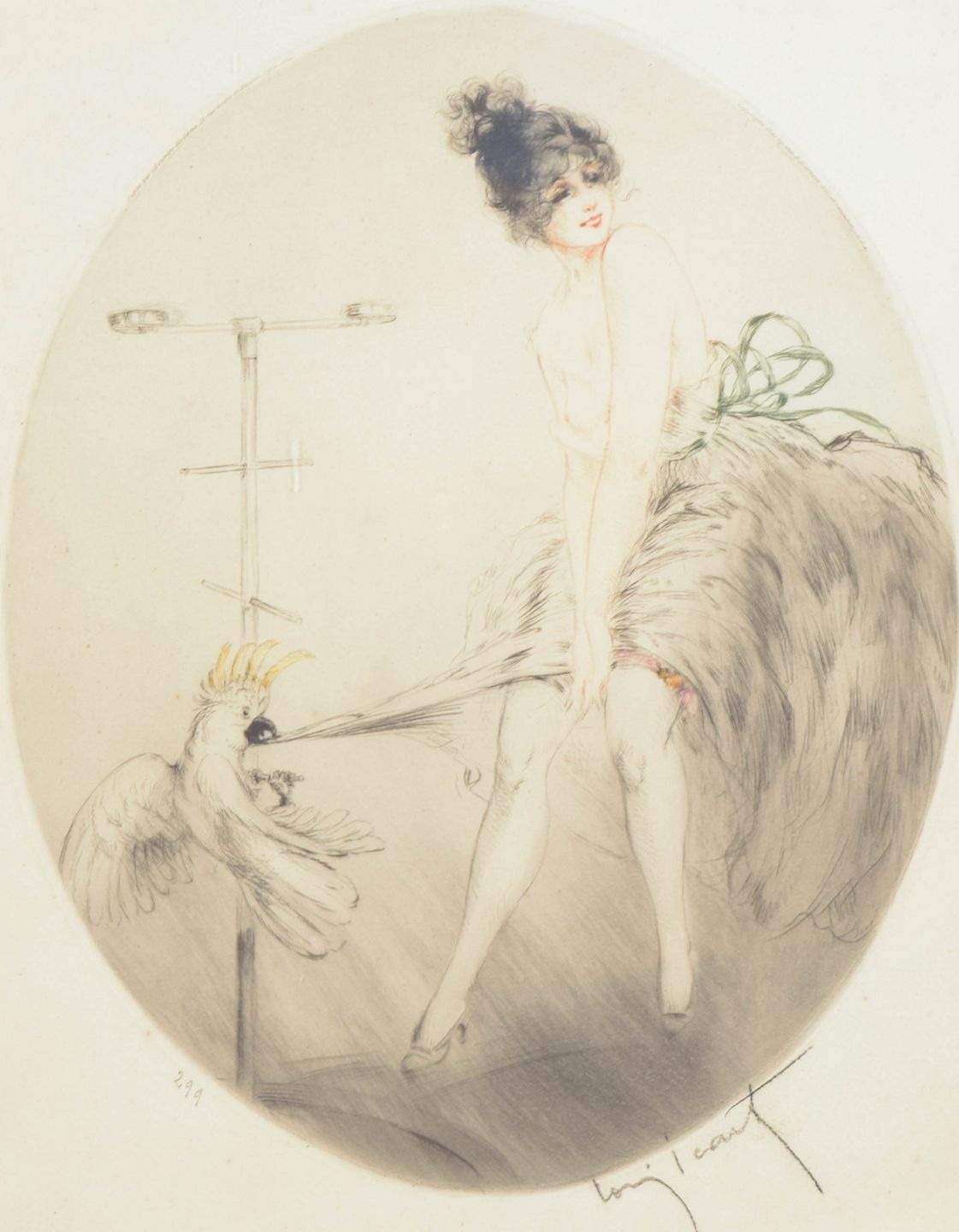 Louis Icart, farve-etsning “Jeune femme et perroquet”, fransk kunstner.