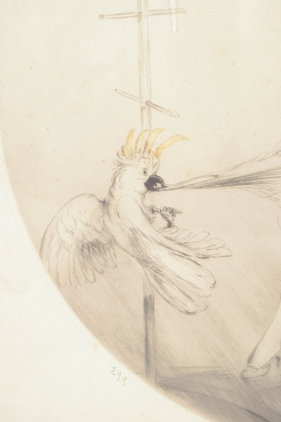 Elegant figurativ komposition udført som farve-etsning med en ung kvinde og en kakadue i et dekorativt og teatralsk motiv.