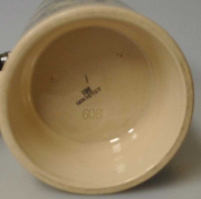 Tysk fajance krus med tinlåg 1909. Dekoration i overføringsteknik med optog. H.: 21,5 cm.
