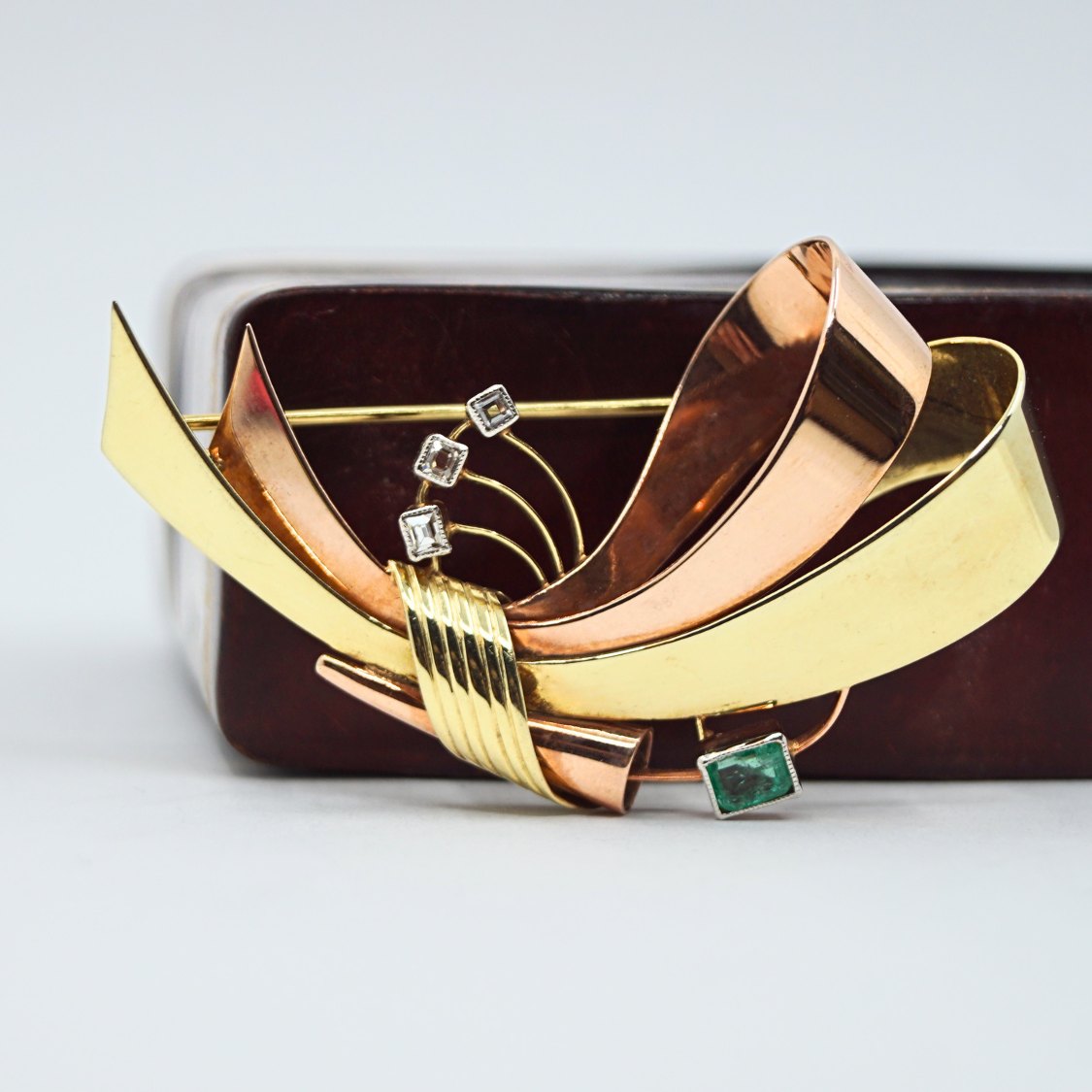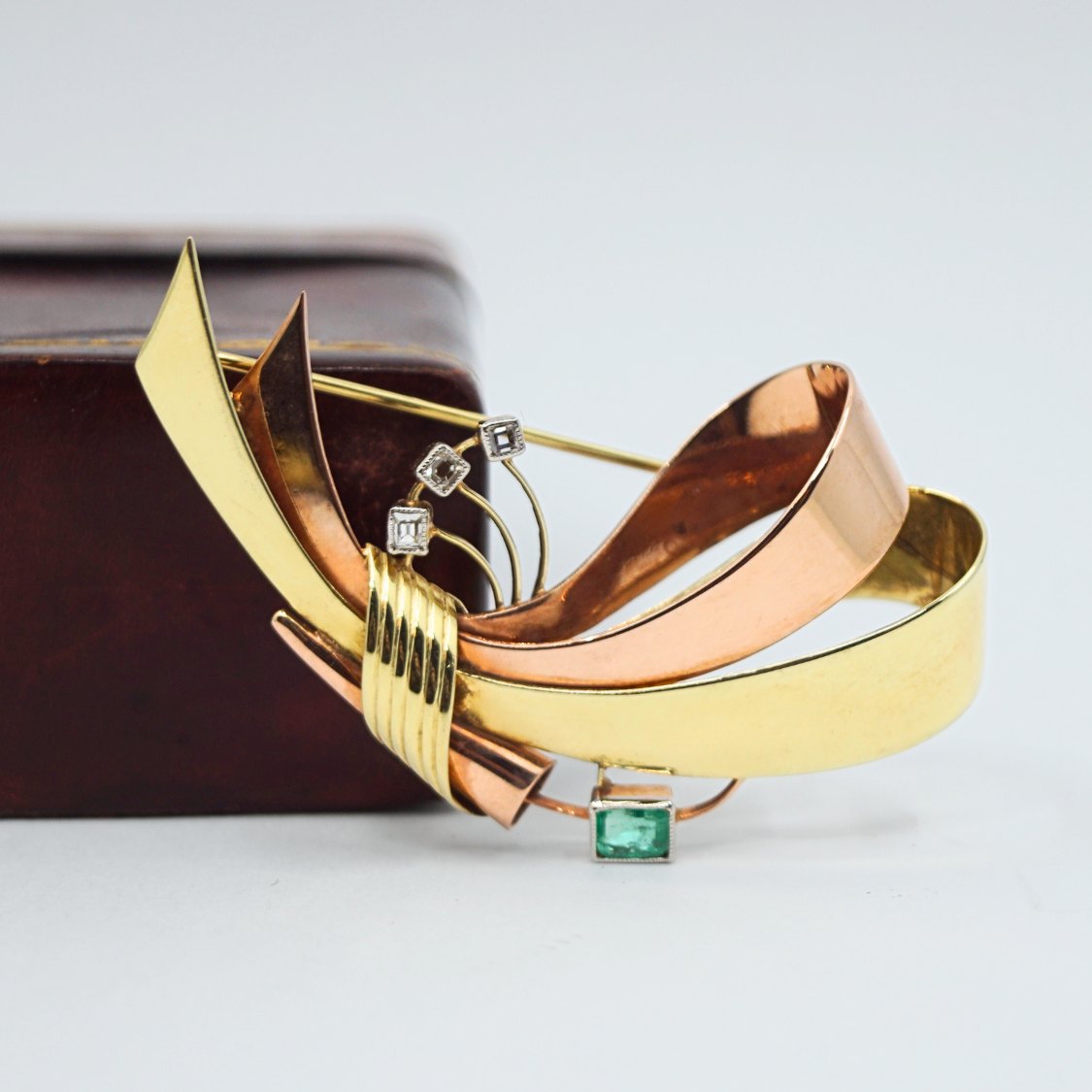 Viggo Wollny; Broche i 14 kt. guld og rosa guld med diamanter og smaragd fattet i hvidguld. Omkring 1930 - 1940.