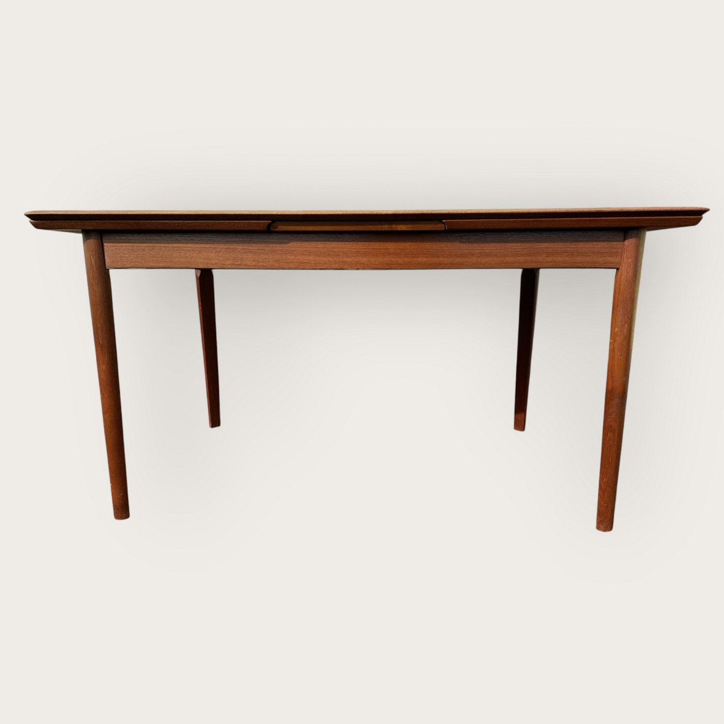 Spisebord i teakfiner med ben i massiv teaktræ, Danish modern fra 1960'erne, mærket med Ellegaards møbelfabrik og EG møbler Silkeborg No 80 (se to fotos), Mål: HxBxL 73x89x139 (240)cm * Pæn brugt stand*