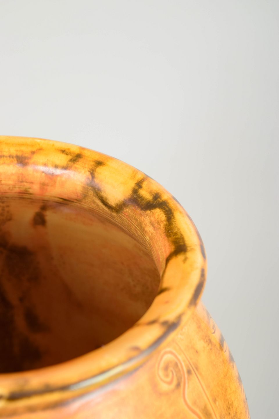 Stor balusterformet vase i glaseret lertøj med reliefdekorerede lodrette felter og bølgende ornamentik. Udført i lys gul glasur med varme orange nuancer og levende variation i overfladen. Signeret HAK i bunden.