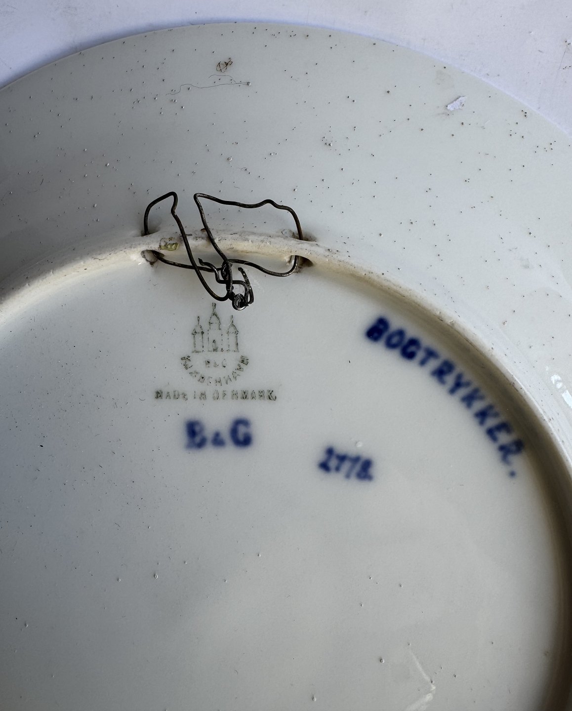 Bing & Grøndahl porcelæns platte; Bogtrykkernes segl i København. Designet af Fanny Garde. Har lidt "støv" på bagsiden øverst (se billeder). Ellers i fin stand. 1. sortering. Ingen skader eller reparationer. Ø. 24 cm.
