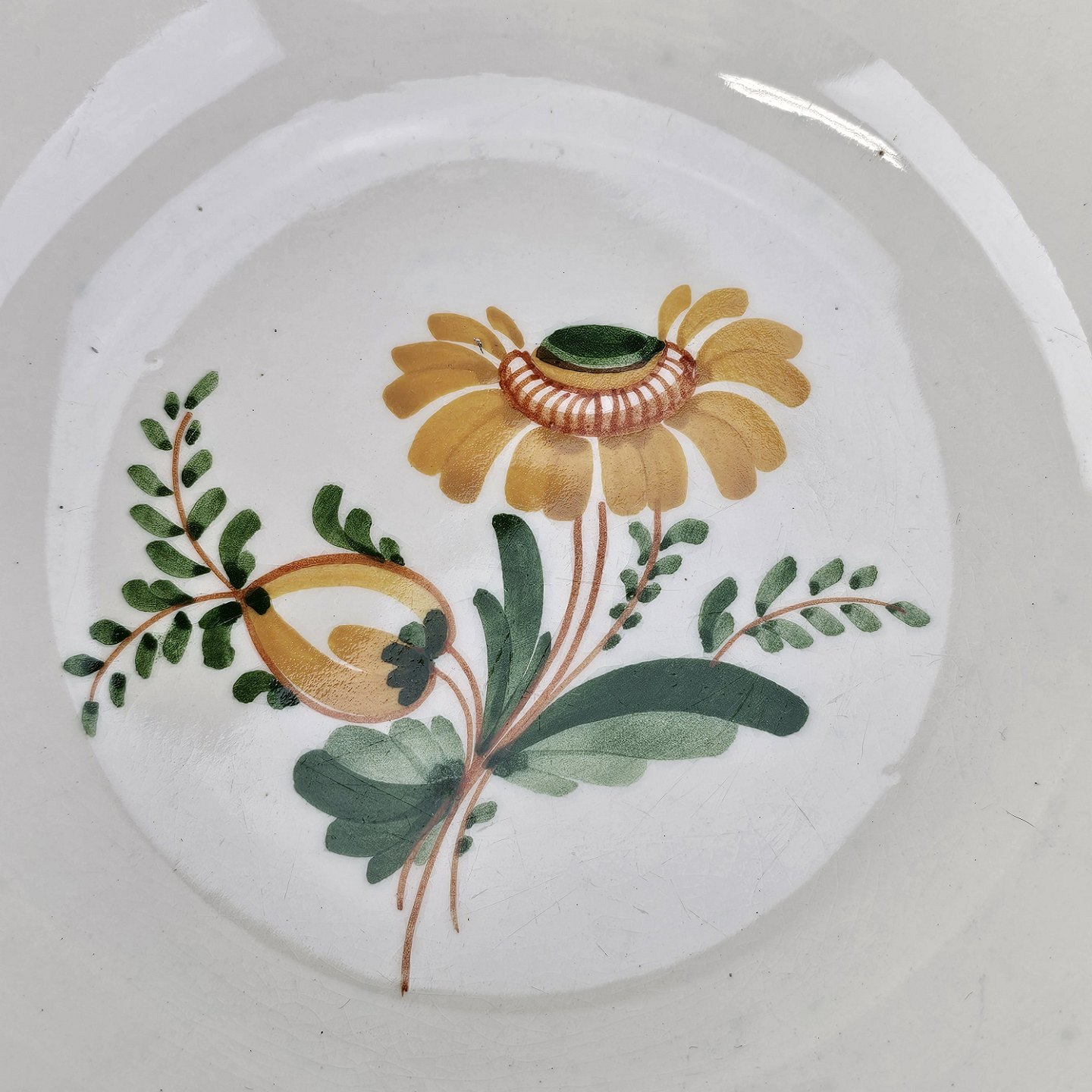 Hvidt fajancestel i stelform Feston/Alma med motiv af gule blomster og grønne blade.