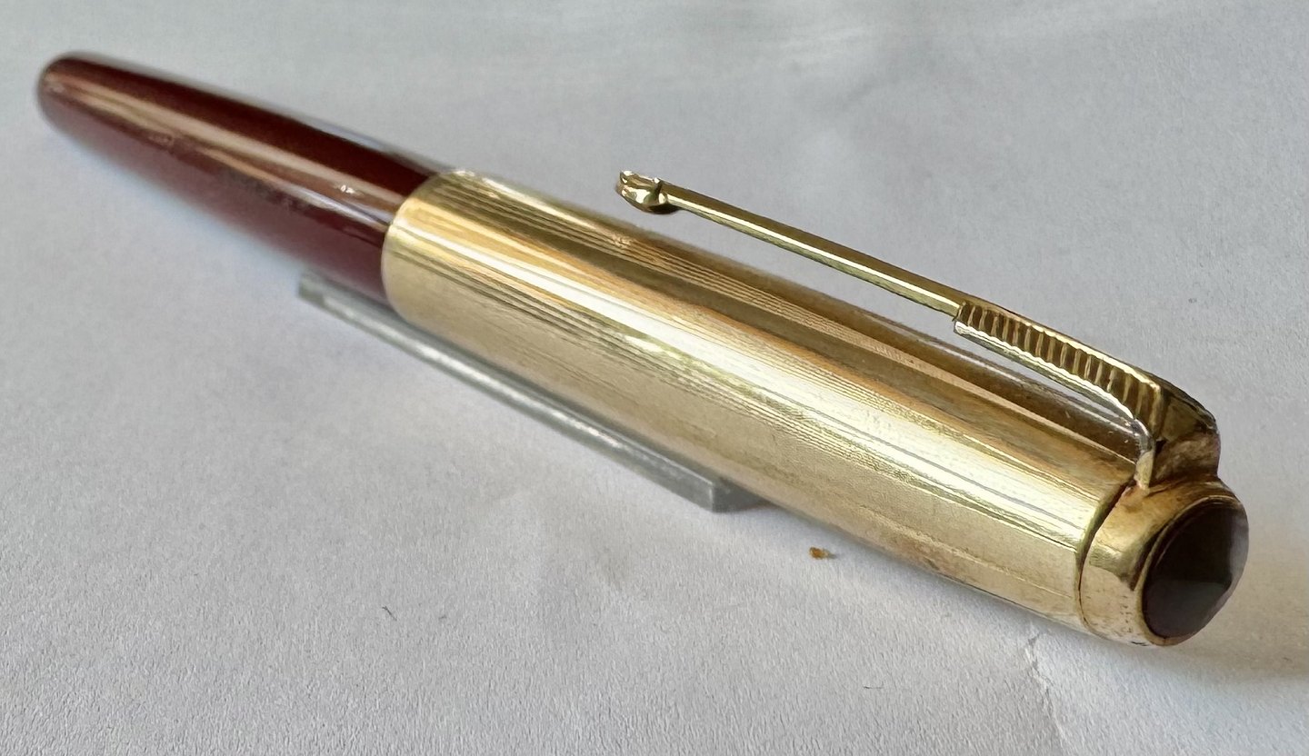 Skriveklar vintage fyldepen: Bordeaux Parker 51 fyldepen med guld double hætte. I god stand. Klar til at blive brugt. Ingen skader eller reparationer. PERSONLIGT NAVN INDGRAVERET. Almindelige brugsspor. L. 14 cm.