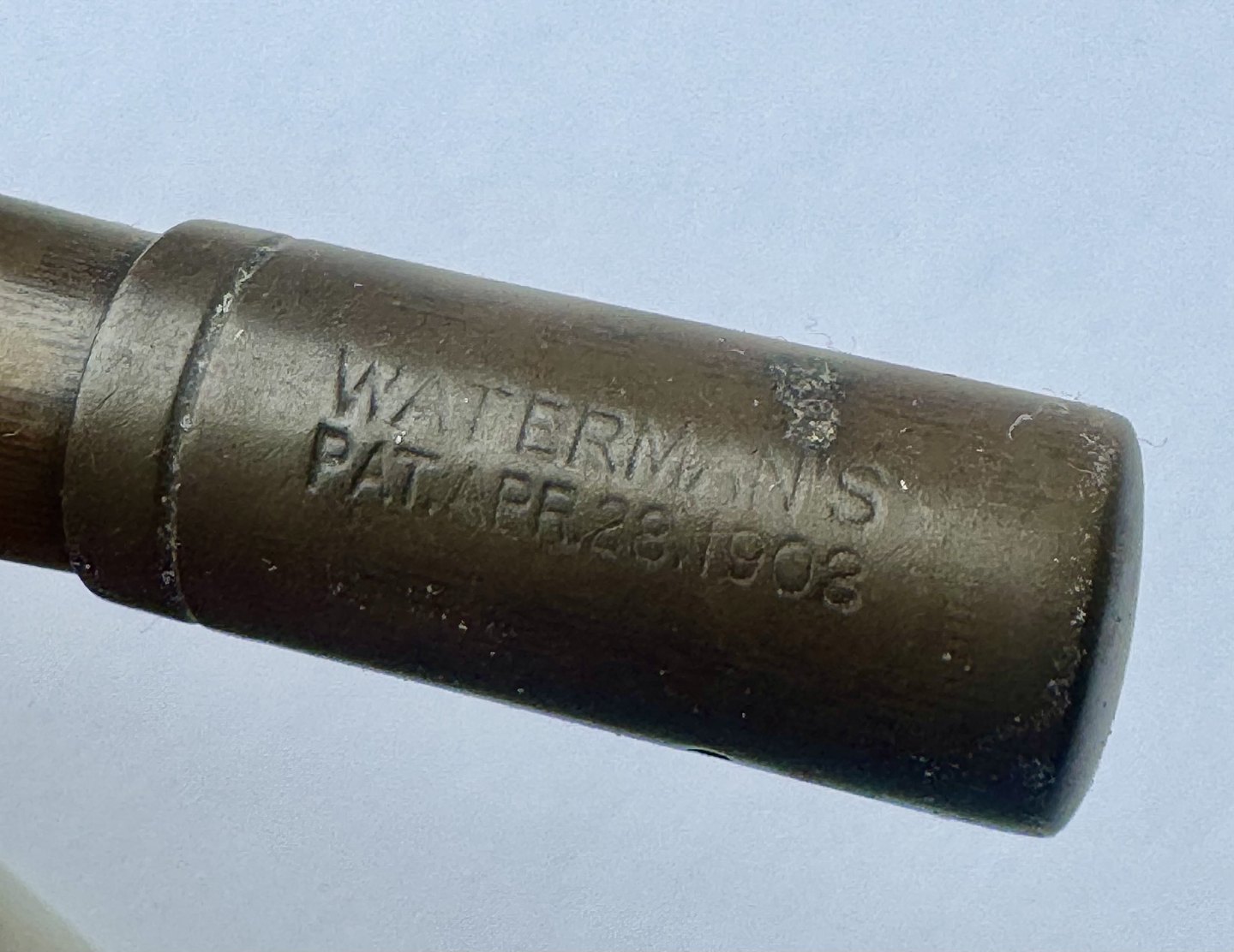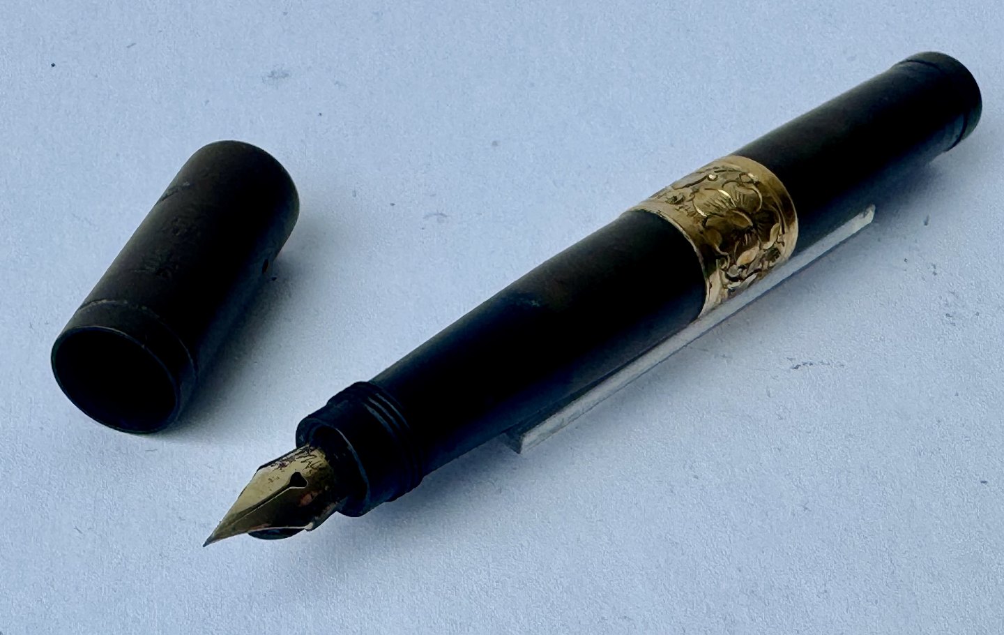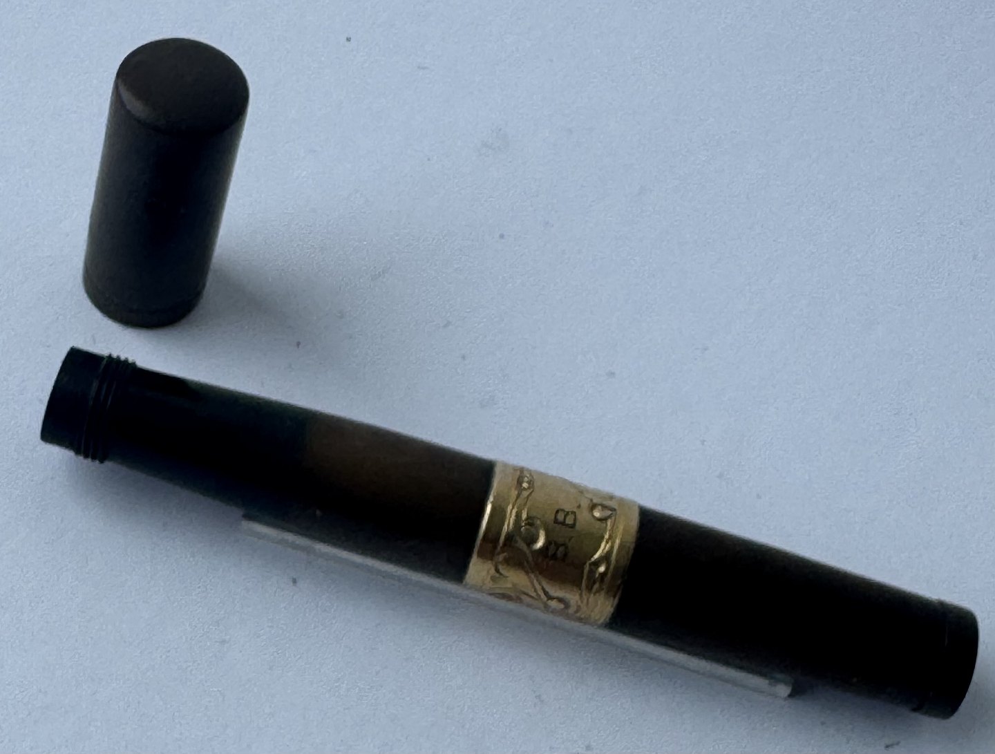 Sort Waterman Safety fyldepen fra 1903. Modelnummer 42 1/2 V er indgraveret på bunden (se foto). Midt på pennen ses et mavebælte i messing dekoreret med en blomst samt ejer initialer B. B. Den originale guldspids kører frem og tilbage når der drejes på bundskruen. Hætten indgraveret WATERMAN’S PAT.APR.28.1903. På bunden, på siden, ses svagt indgraveret WATERMAN samt SAFETY. Fremstår i god stand uden skader eller reparationer. Lidt misfarvning. Længde: 8,7 cm