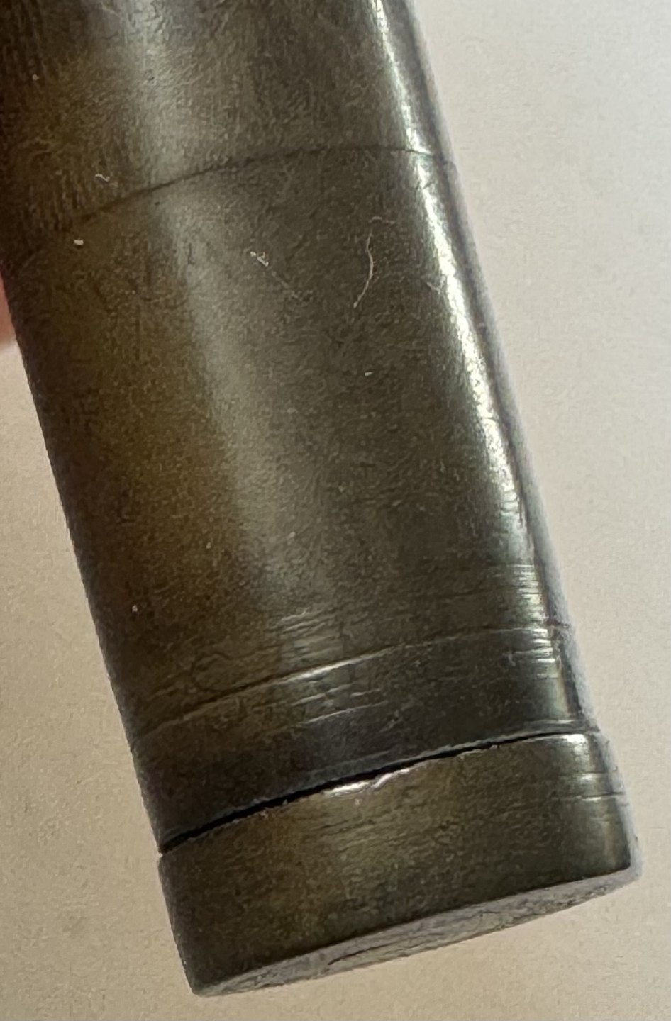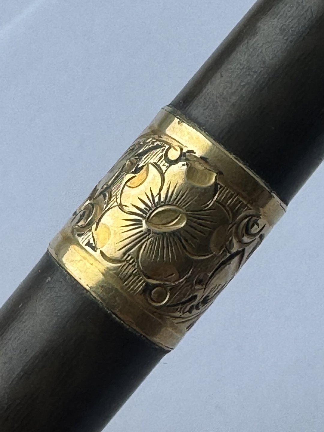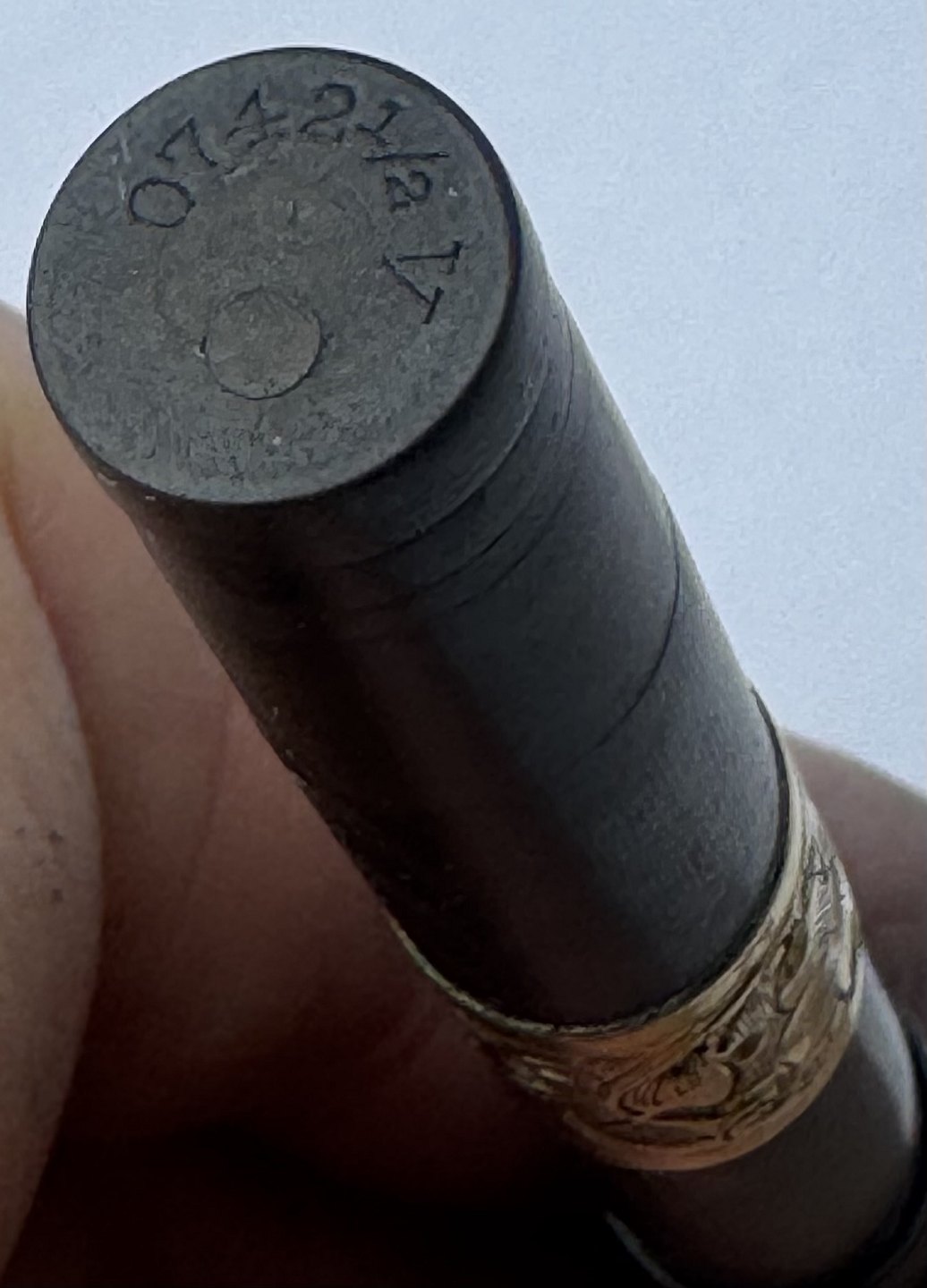 Sort Waterman Safety fyldepen fra 1903. Modelnummer 42 1/2 V er indgraveret på bunden (se foto). Midt på pennen ses et mavebælte i messing dekoreret med en blomst samt ejer initialer B. B. Den originale guldspids kører frem og tilbage når der drejes på bundskruen. Hætten indgraveret WATERMAN’S PAT.APR.28.1903. På bunden, på siden, ses svagt indgraveret WATERMAN samt SAFETY. Fremstår i god stand uden skader eller reparationer. Lidt misfarvning. Længde: 8,7 cm