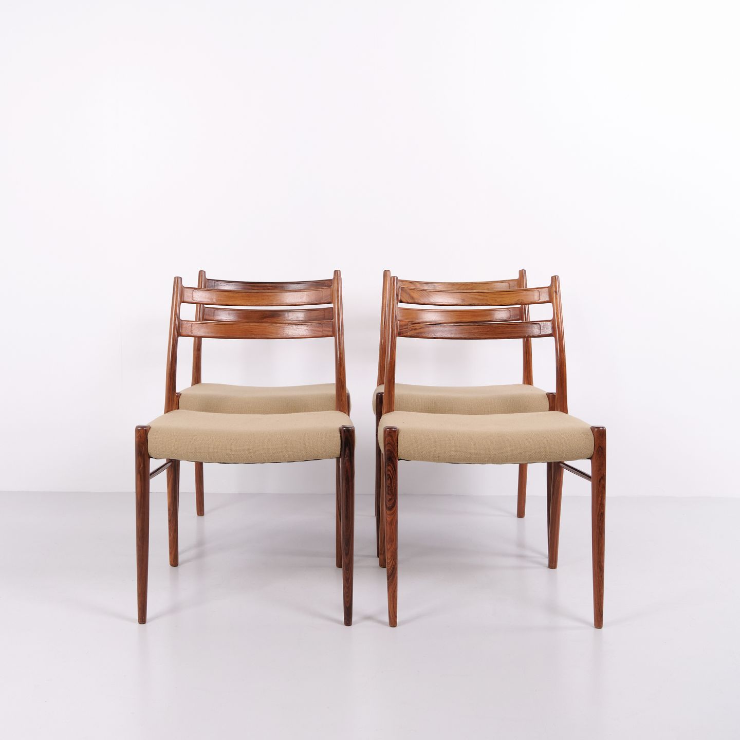 Sæt af 4 spisebordsstole i palisander af Arne Wahl Iversen for Glyngøre Stolefabrik. Dansk design fra 1950’erne.