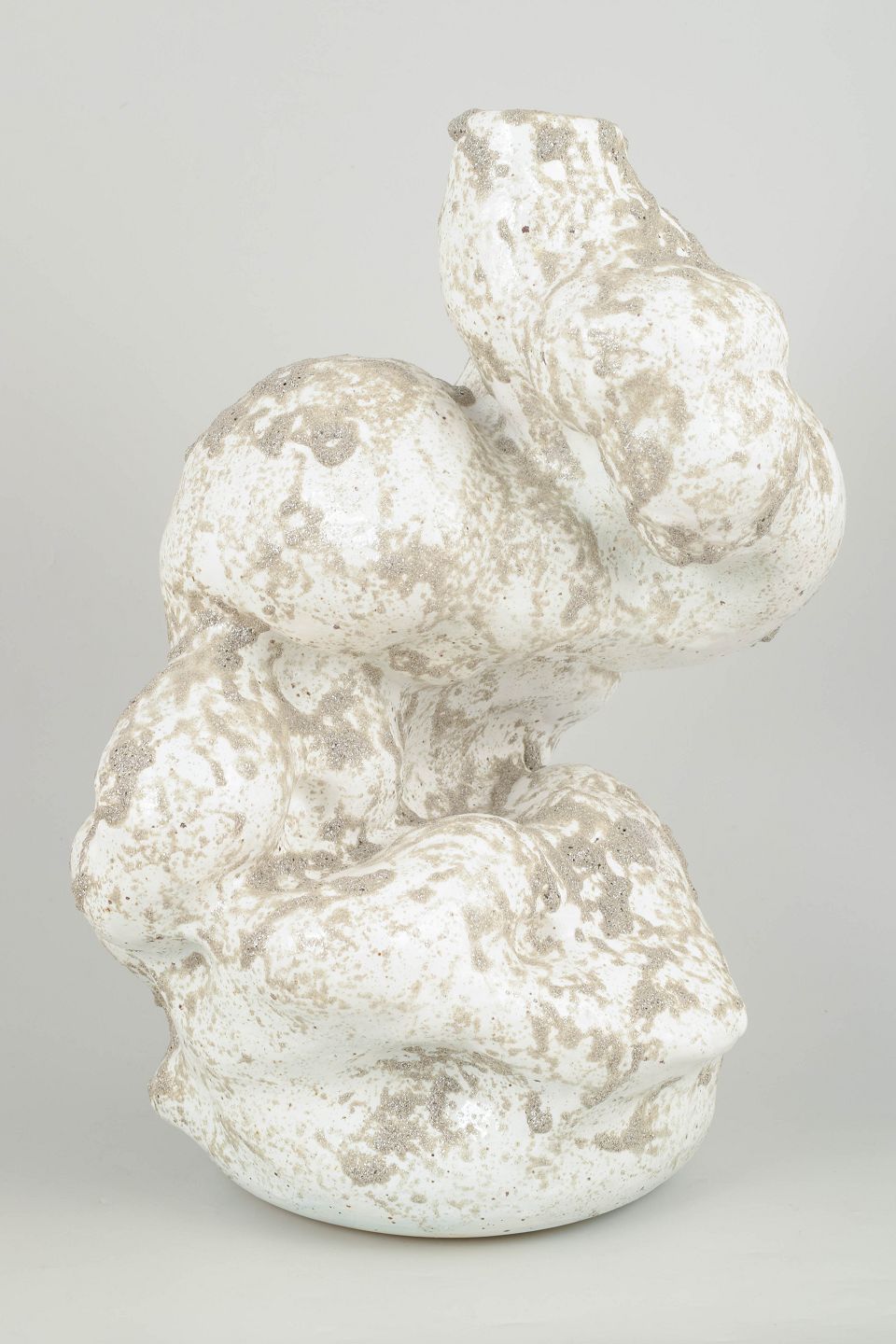 Høj unika stentøjsvase, organisk formet. Glasuren er en hvid blank med grå, mat glitter glasur, der henleder tankerne på vådt sand.