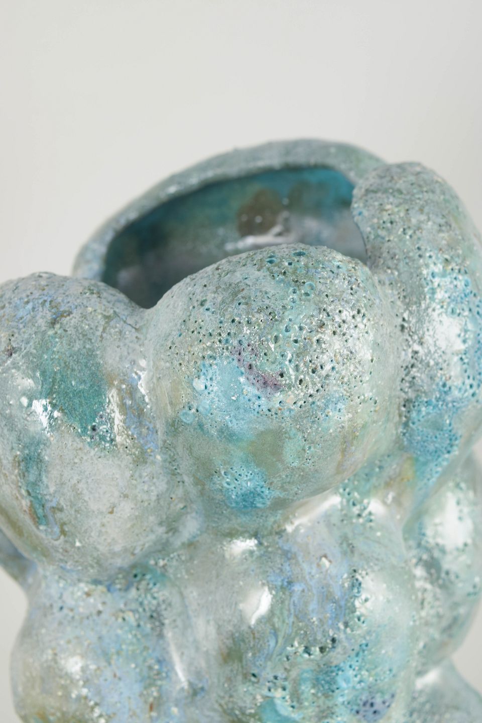 Høj, slank unika stentøjsvase. Glasuren er en grønlig turkis med blå toner og tekstureret overflade. Vasen står på tre integrerede fødder. Denne skulptur er en del af 'Salt' serien af Christina Muff.