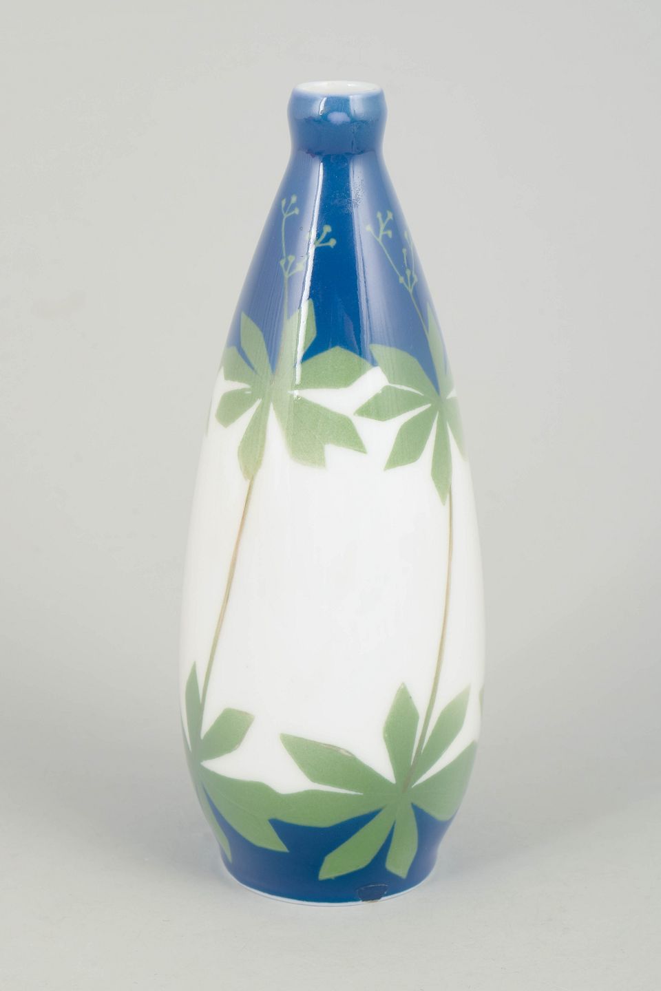 Elegant vase i porcelæn med organisk art nouveau dekoration i blå og grønne nuancer med stiliserede bladmotiver.