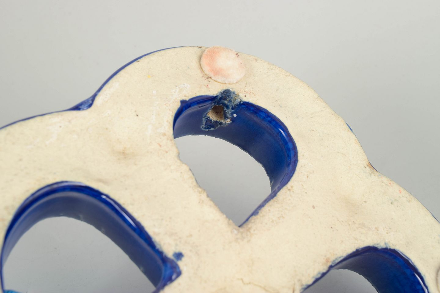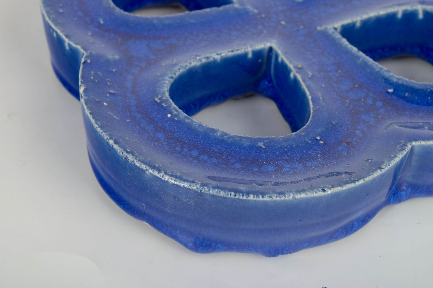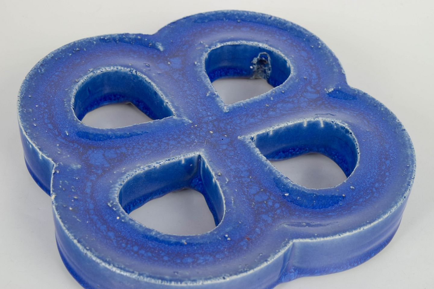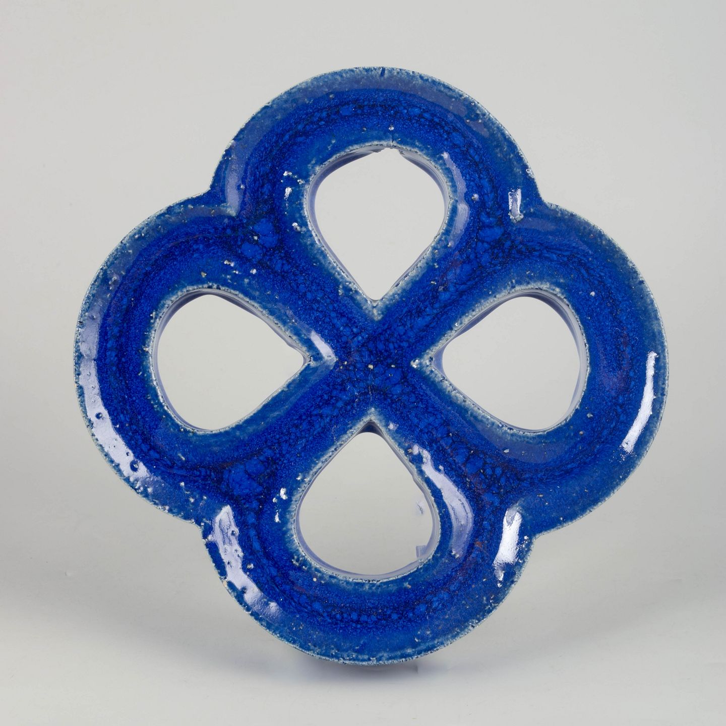 Dekorativt vægrelief i stentøj med organisk firkløverform og gennemgående åbninger. Udført med dyb blå, levende glasur med bobleeffekt og variation i overfladen. Bagside med hul til ophæng.