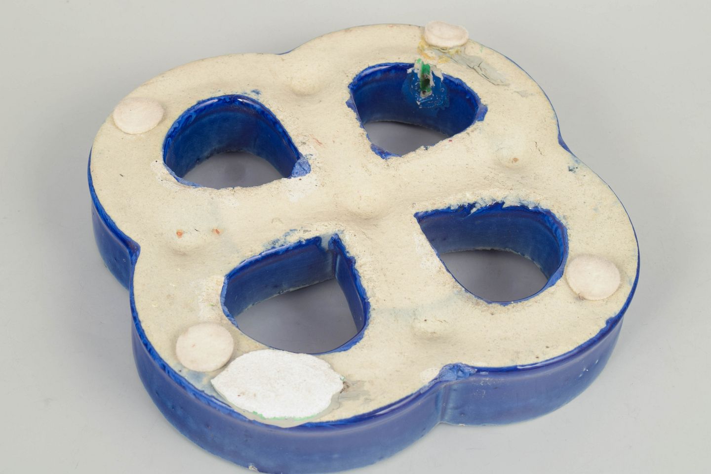 Dekorativt vægrelief i stentøj med organisk firkløverform og gennemgående åbninger. Udført med dyb blå, levende glasur med bobleeffekt og variation i overfladen. Bagside med hul til ophæng.