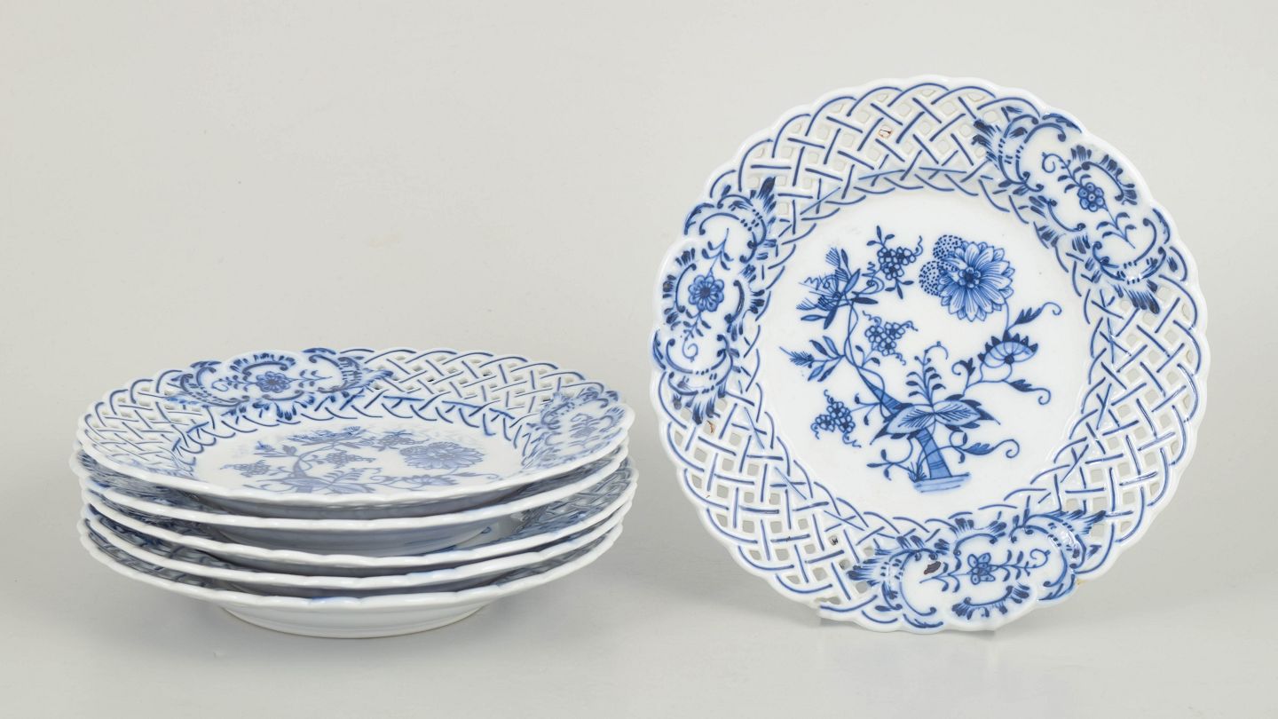 Klassiske salattallerkener i porcelæn med gennembrudt fane og blå løgmønstret dekoration i underglasur. Traditionelt håndmalet udtryk med fin detaljering.