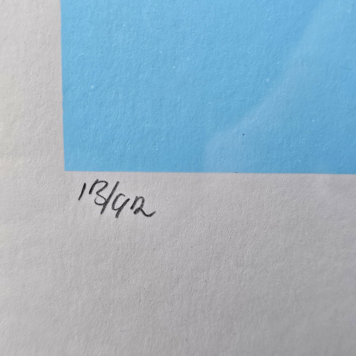Litografi med blå, hvide og gule farver på lyseblå baggrund i metal ramme. 13/92