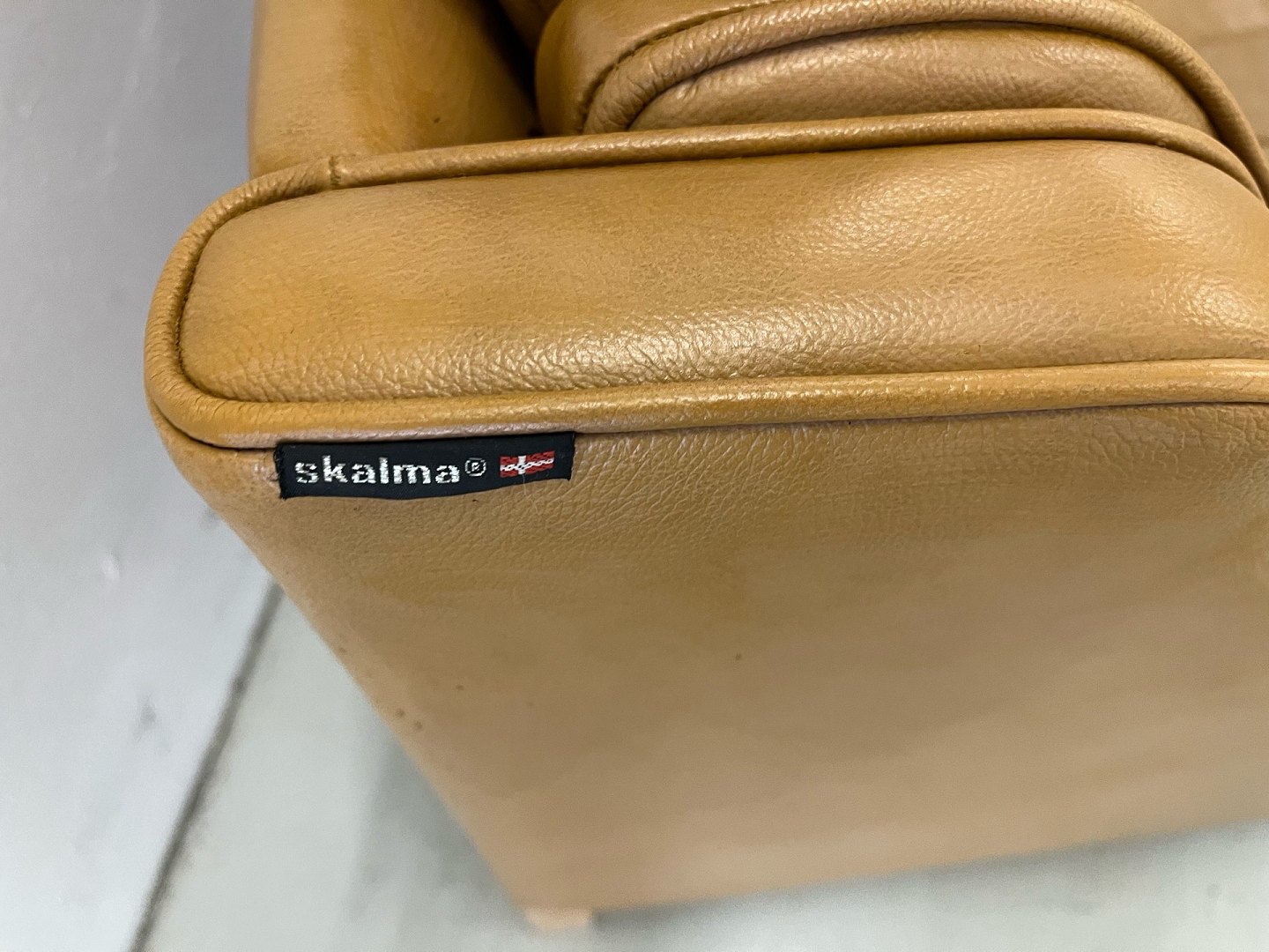 Eksklusivt sæt bestående af Skalma Cerena øreklapstol, lav stol og skammel, udført i semianilin cognacfarvet læder (668/08) med ben i lys sæbebehandlet bøg.